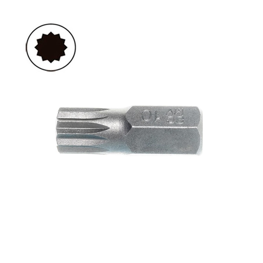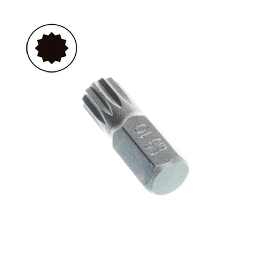 Бита 12-ти лучевая СПЛАЙН М10 изготовлена из стали S2 (Cr-Ni-Mo). Бита SPLINE (СПЛАЙН) M10 имеет посадку под внутренний шестигранный привод (HEX) размером 10мм. Длина двенадцатигранного бита составляет 30мм. Твердость биты 12-ти гранной звездочки составляет 58-62 HRC. Силовая ударная бита для ручного и механизированного инструмента. Например, может использоваться для ударной отвертки с держателем бита на 10мм.