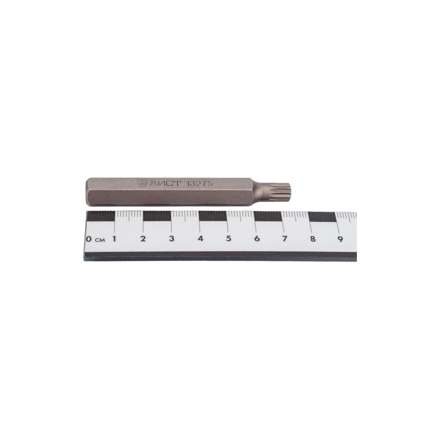 Длинная 12-ти лучевая бита СПЛАЙН М8 изготовлена из стали S2 (Cr-Ni-Mo). Длинная бита SPLINE (СПЛАЙН) M8 имеет посадку под внутренний шестигранный привод (HEX) размером 10мм. Длина двенадцатигранного бита составляет 75мм. Твердость биты 12-ти гранной звездочки составляет 58-62 HRC. Длинная силовая ударная бита для ручного и механизированного инструмента. Например, может использоваться для ударной отвертки с держателем бита на 10мм.