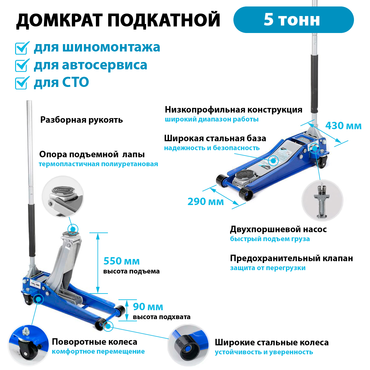 Профессиональный подкатной домкрат 5 тонн предназначен для использования в шиномонтаже, автосервисе или СТО. Шиномонтажный подкатной домкрат 5т имеет минимальную высоту подхвата 90мм и максимальную высоту подъема 550мм. Сможет поднять любой легковой автомобиль, кроссовер, внедорожник или легкий коммерческий транспорт. Домкрат на 5 тонн имеет усиленную конструкцию и широкую стальную базу, которая обеспечивает необходимую устойчивость на поверхности.