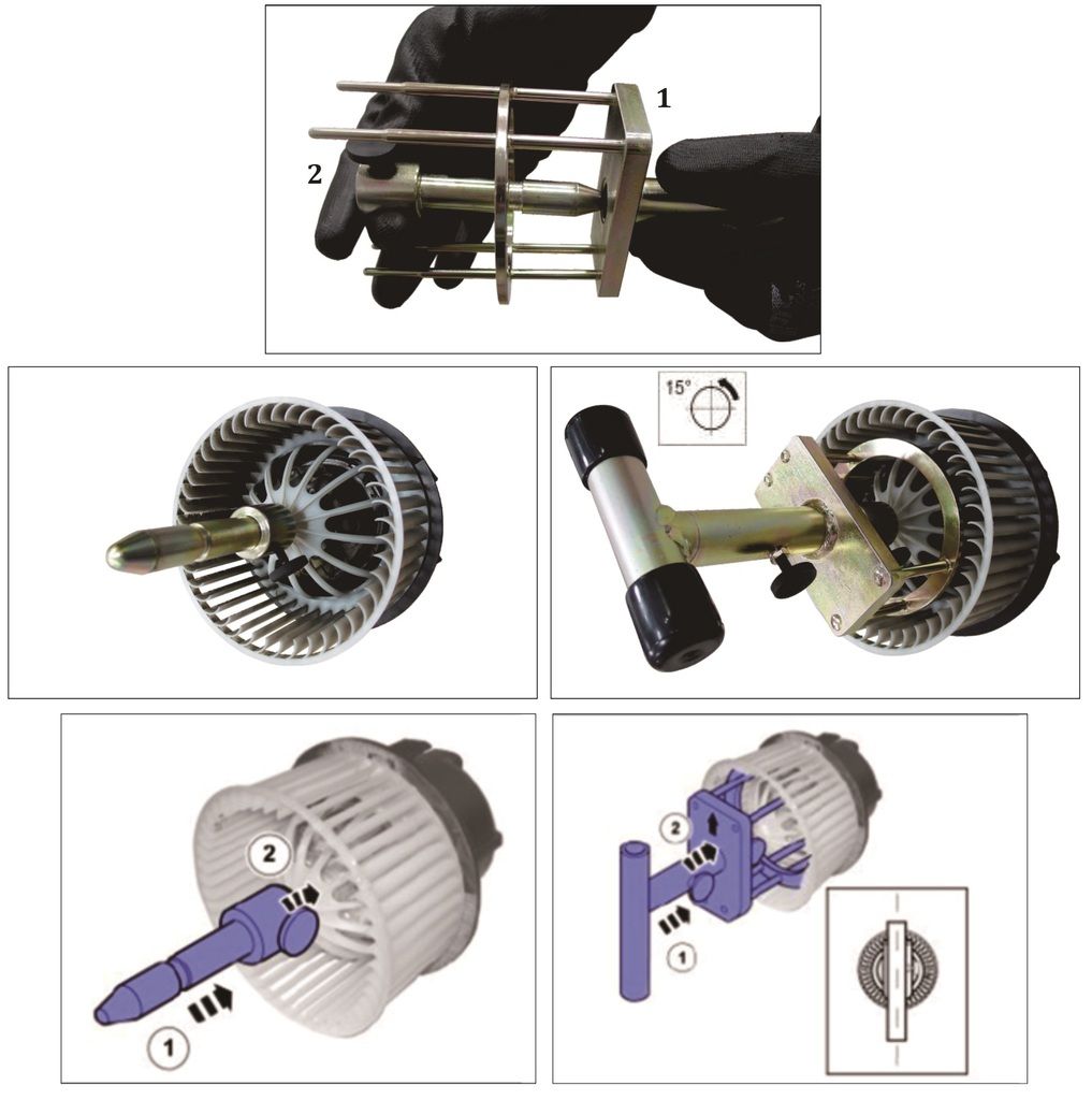 Съемник 9997284 или 412-140 используется для установки/удаления мотора и вентилятора отопителя (мотора печки). Приспособление для снятия/установки электродвигателя вентилятора для VOLVO, JAGUAR, LAND ROVER.