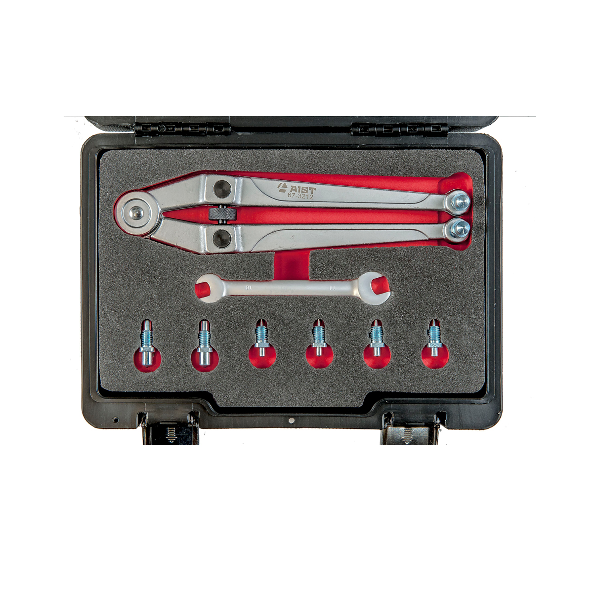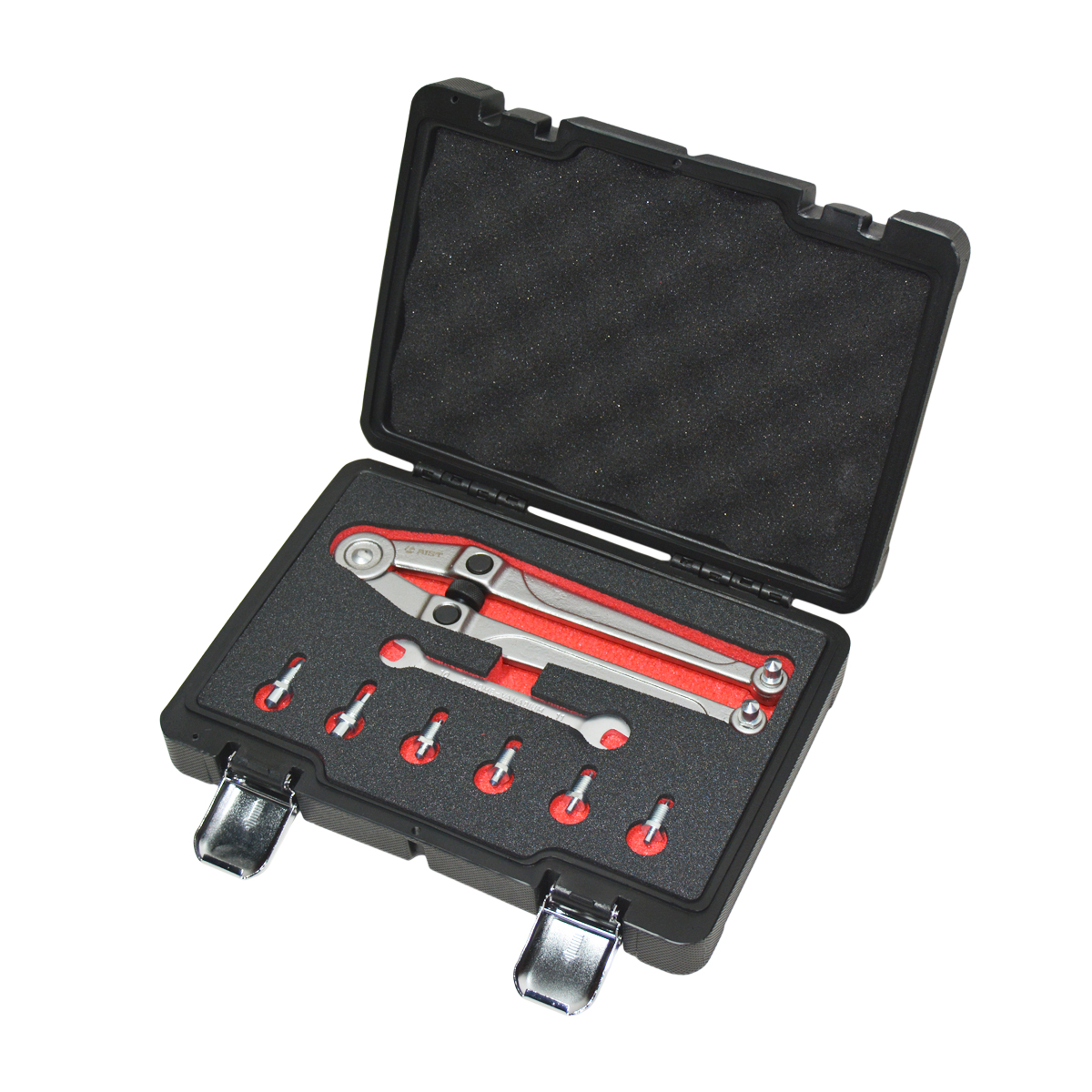 Усовершенствованный цапфовый ключ VAG 3212 представляет собой универсальный ключ с набором сменных штифтов, который применяется для удержания шкивов, шестерен и вискомуфт на автомобилях VAG (Volkswagen, Seat, Skoda, Audi) и для других автомобилях различных марок. Съемные штифты и центральная регулировочная гайка подходят для любого размера. Цапфовый ключ VAG 3212 предназначен для фиксации или снятия шкивов с двумя отверстиями.