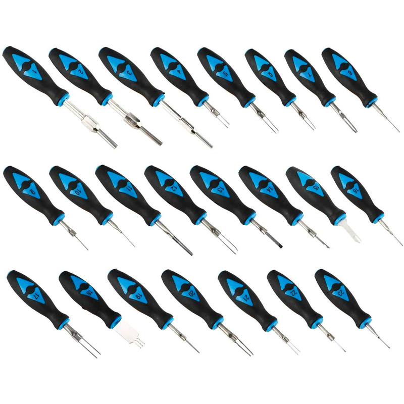 Набор для разборки пинов поставляется в кейсе. Каждый экстрактор для пинов контактов и разъемов клемм электропроводов расположен в индивидуальном посадочном месте кейса.