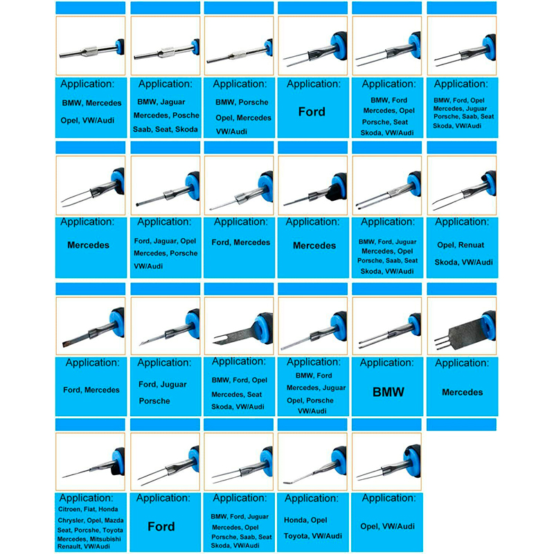 - экстракторы контактов подходят для BMW, Mercedes, Opel, VW, Audi, Porsche, Ford, Seat, Skoda, Jaguar, Citroen, Fiat, Saab, Mazda, Renault, Chrysler, Toyota, Honda, Mitsubishi и др.