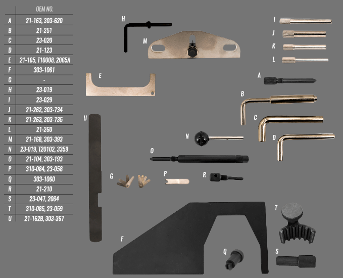 Набор фиксаторов используется для ремонта двигателя, замены ремня или цепи ГРМ и для установки фаз ГРМ. Данный набор фиксаторов применим к двигателям FORD, MAZDA бензиновые: 1.25, 1.4, 1.6, 1.7, 1.8, 2.0, 2.3 (включая турбо) и дизельные 1.4 TDCi, 1.6 D/TDCi, 1.8 D/TD, 1.8 TDDI, 1.9 TDI, 2.0 TDCI, 2.5D/DI/TURBO/TCI. В набор входят специальные щупы 0.2 и 0.3 мм. Также данный набор фиксаторов применим к дизельным двигателям PSA 1.4 и 1.6 TDCI/HDI/D, к двигателям VOLVO и к двигателям VAG 1.3, 1.4, 1.5, 1.6, 1.7, 1.9, 2.4, 2.5 D/TDI/SDI.