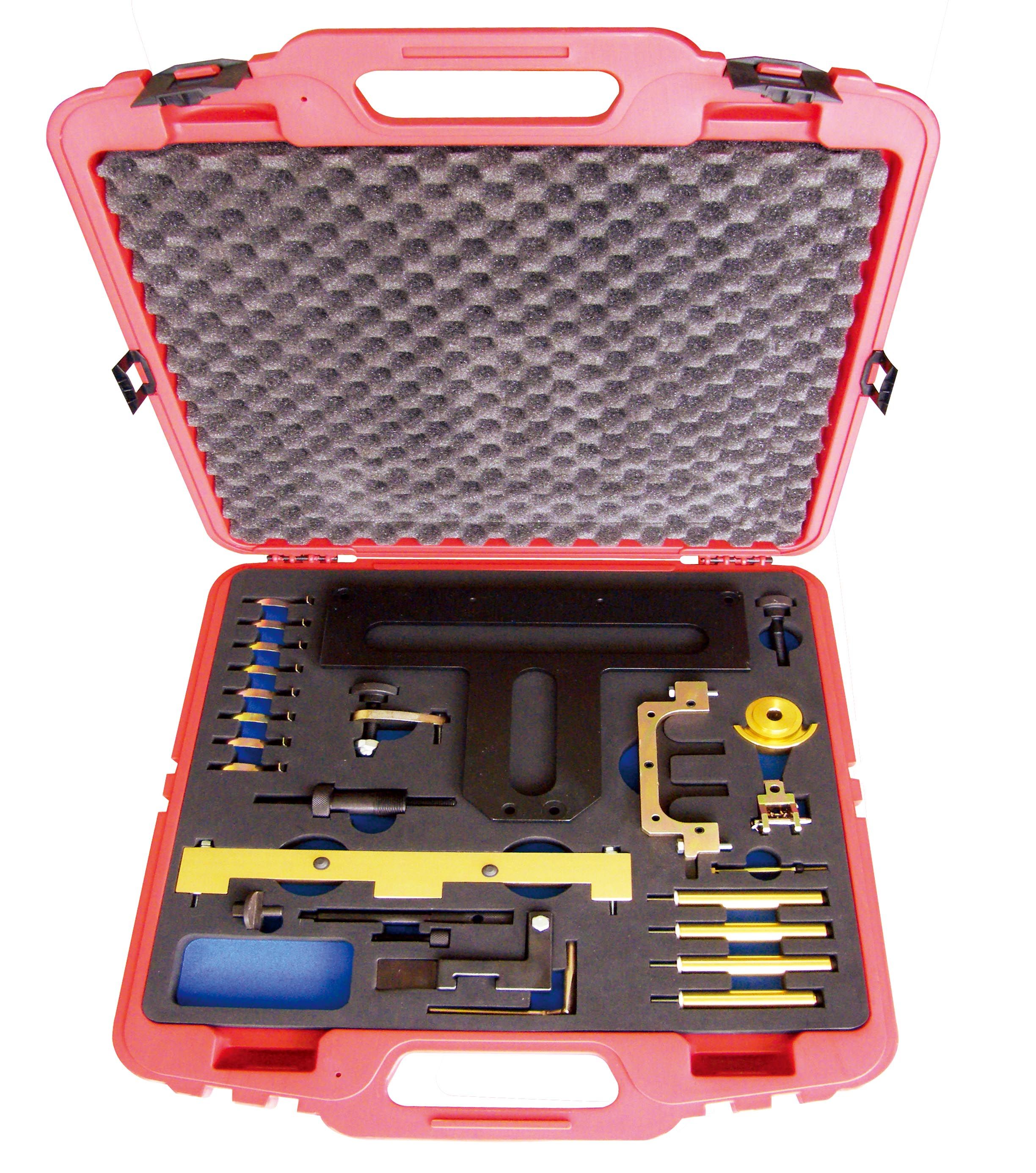 Полный набор специнструментов, с помощью которого возможно производить: регулировку и настройку фаз ГРМ, регулировку VANOS, замену привода ГРМ, ремонт двигателя, обслуживание Valvetronic. Набор позволяет произвести снятие и установку промежуточных рычагов, что влечет за собой снятие распределительных валов с ГБЦ. Набор позволяет произвести безопасную замену торсионных пружин. Применим к двигателям BMW серии N42, N46, N46T с рабочим объемом 1.8 и 2.0 литра DOHC 16V.