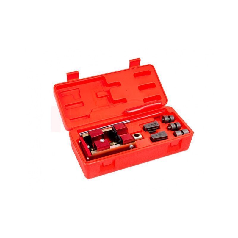 Профессиональный набор для развальцовки трубок тисочного тип для односторонней и двусторонней развальцовки трубок. Например, данный набор применяется для развальцовки медных тормозных трубок автомобиля, трубок кондиционера и других трубок, изготовленных из мягких металлов. Развальцовщик для дюймовых и метрических трубок. Приспособление в виде тисков с поворотным конусным винтом применяется для развальцовки стальных, алюминиевых и медных трубок при ремонте и обслуживании автомобилей.