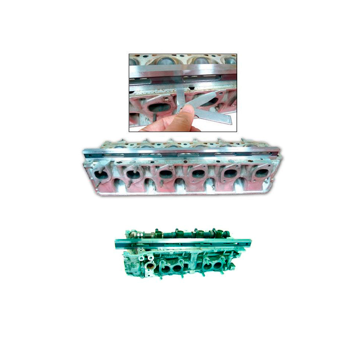 - поставьте линейку для плоскостей ГБЦ ребром на поверхность головки, сначала посредине вдоль оси головки, а затем по диагоналям и измерьте щупом зазор между плоскостью головки и линейкой;