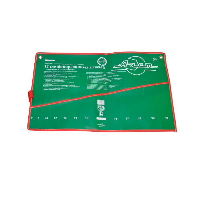 Сумку для набора комбинированных ключей можно скрутить и компактно хранить или перевозить в автомобиле. Для закрепления есть специальная липучка застежка. Скрутка имеет отверстия для подвеса в любом удобном месте.