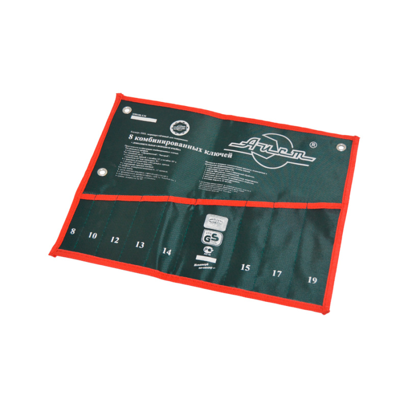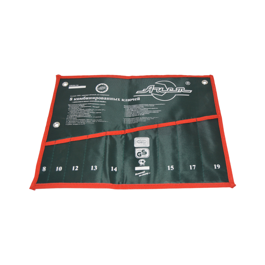 Сумка чехол для гаечных комбинированных ключей на 8 предметов. Скрутка для гаечных ключей подойдет для хранения типовых размеров ключей от 8 до 19 мм. Каждый отсек сумки органайзера пронумерован.