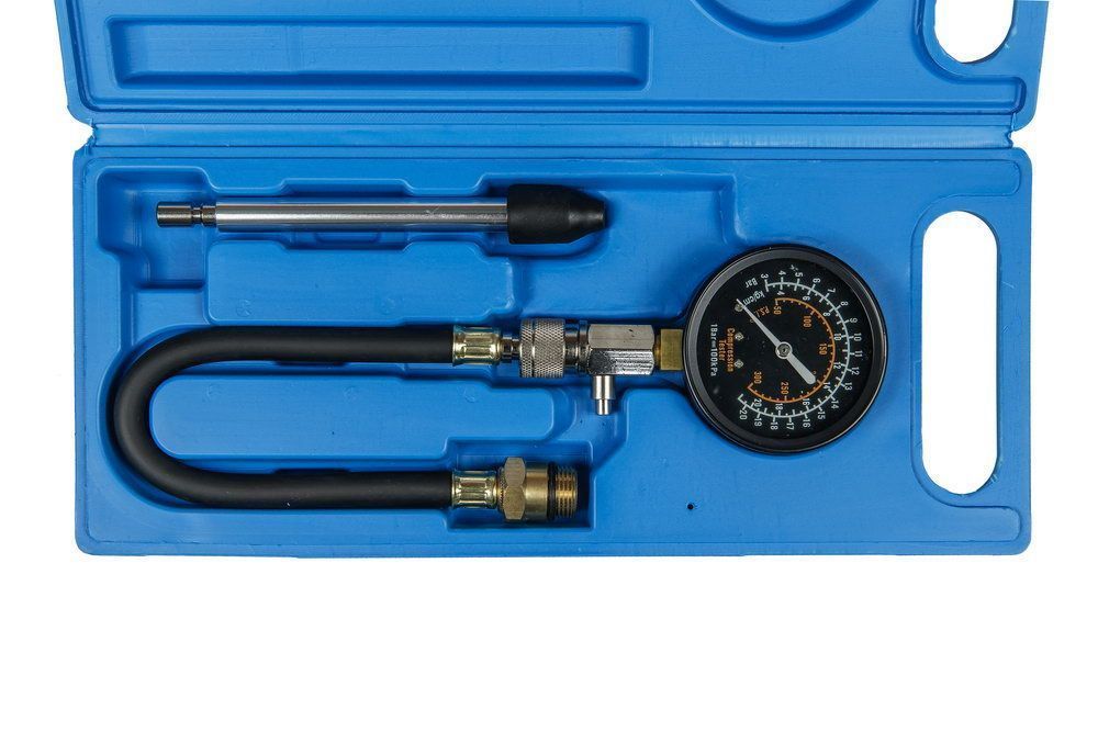 Универсальный компрессометр для бензиновых двигателей большинства автомобилей. Предназначен для измерения компрессии в бензиновых двигателях. Прибор для измерения компрессии в двигателе оснащен клапаном для сброса давления, гибким шлангом в комплекте со штуцером и стойкой с резиновым прижимным наконечником (для измерения давления путем удерживания компрессометра).