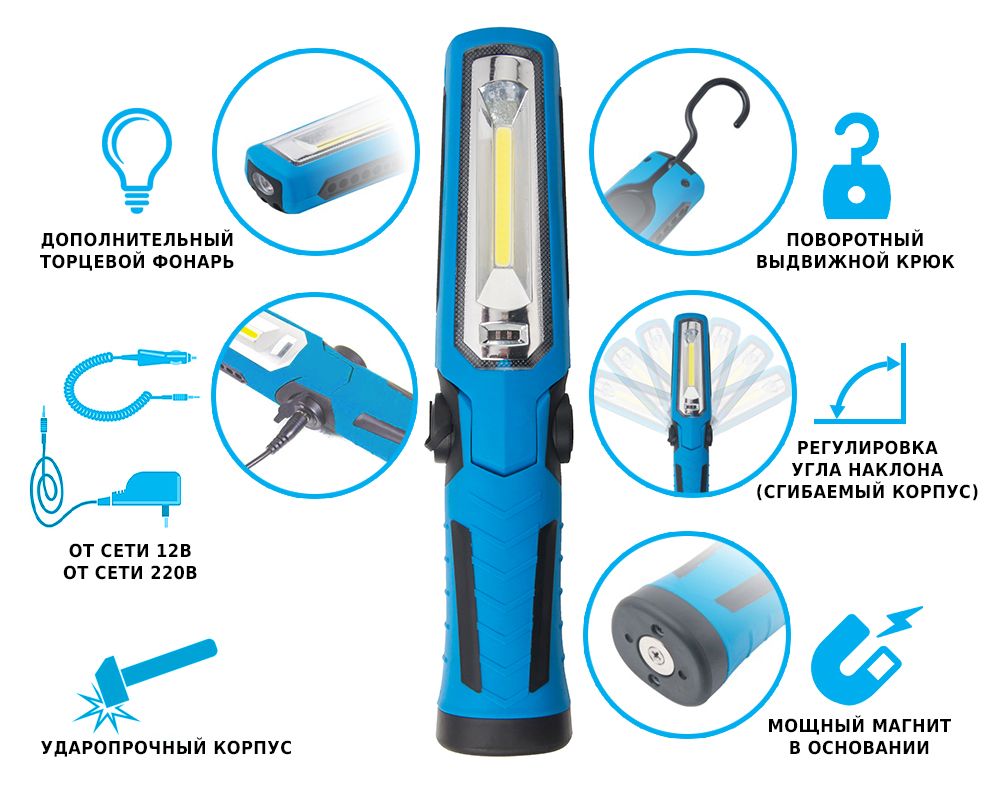 Лампа переноска светодиодная 19311730 (фонарь автомобильный светодиодный аккумуляторный с магнитом) - вершина эволюции светодиодных автопереносок! Имеет мощный магнит в основании и сгибаемый корпус. Подходит как для автосервиса, для гаража, так и для ремонта автомобиля. Заряжается от сети 220В и от прикуривателя 12В, а работает только за счет встроенного аккумулятора (3 часа). Сгибаемый корпус позволяет направлять свет в необходимом направлении. Магнит и крюк позволяет использовать переноску, не держа ее в руках. Противоударный (обрезиненный) корпус исключает повреждение светодиодов и "внутренностей" переноски. На картинке можно увидеть примеры использования беспроводной лампы. Данная светодиодная лампа переноска имеет следующие характеристики: