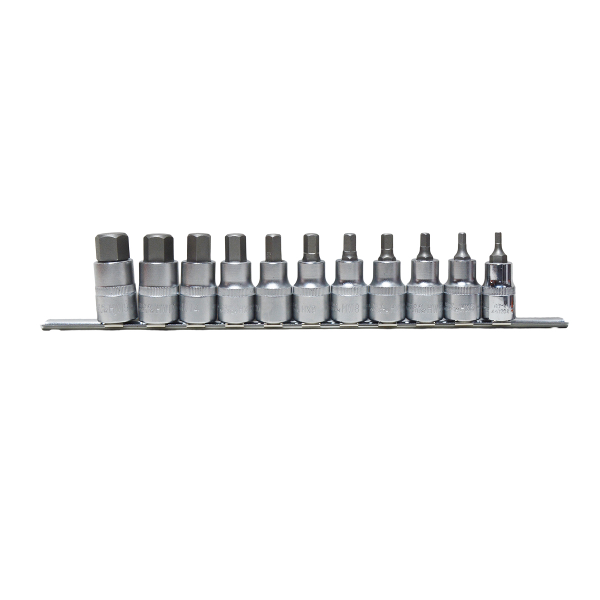 Профессиональный набор торцевых головок-битов(вставок) HEX (6-ти гранных) H4-H19 1/2" 11 предметов на металлическом рельсе. Головки-биты шестигранники стандатной длины 55мм.
