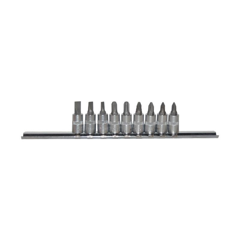Профессиональный набор головок-битов (вставок) шлицевых (плоских) SLOTTED, крестовых PHILLIPS и крестовых POZIDRIV 1/4" 9 предметов на планке используется вместе с ручным инструментом (воротком или трещоткой) с присоединительным квадратом 1/4" дюйма. Биты (вставки) изготовлены из S2 (Cr-Ni-Mo) стали. Имеют длину 32мм и посадку под 1/4" дюйма.