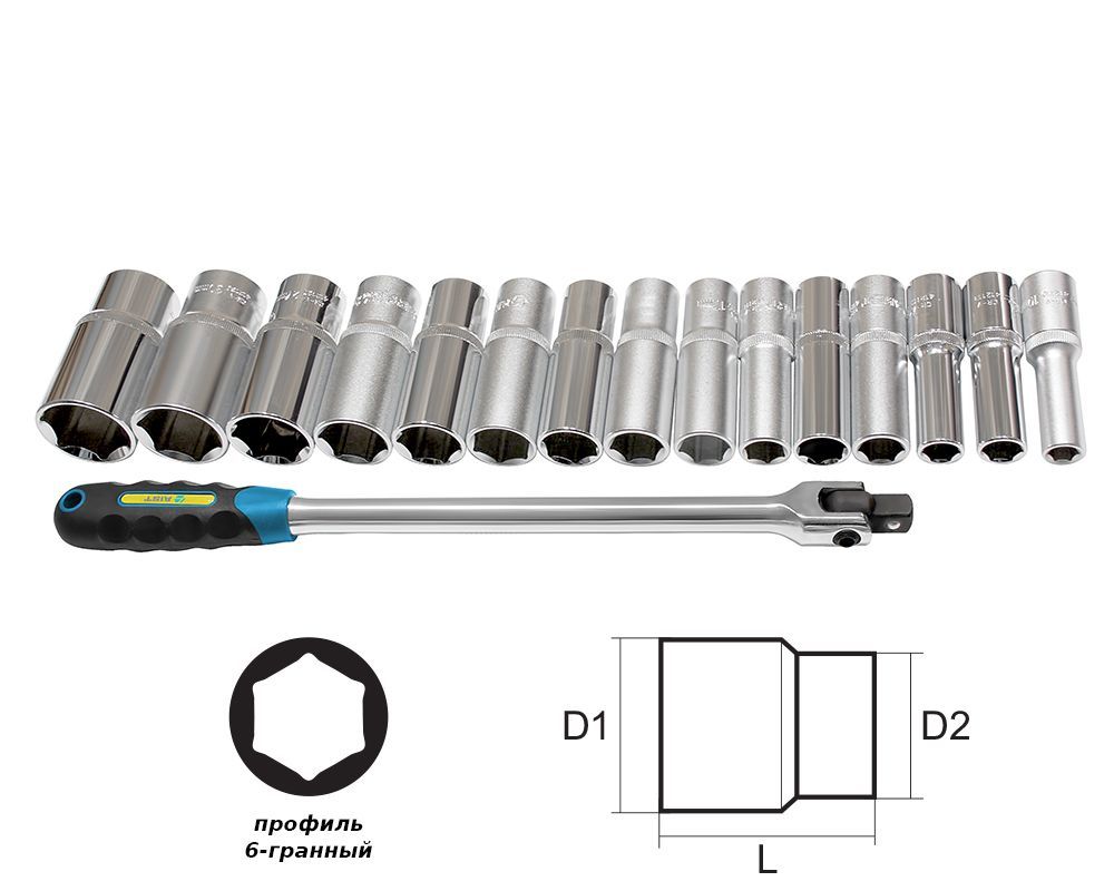 - 1/2" Головка глубокая: 10, 12, 13, 14, 15, 16, 17, 18, 19, 21, 22, 24, 27, 30, 32мм