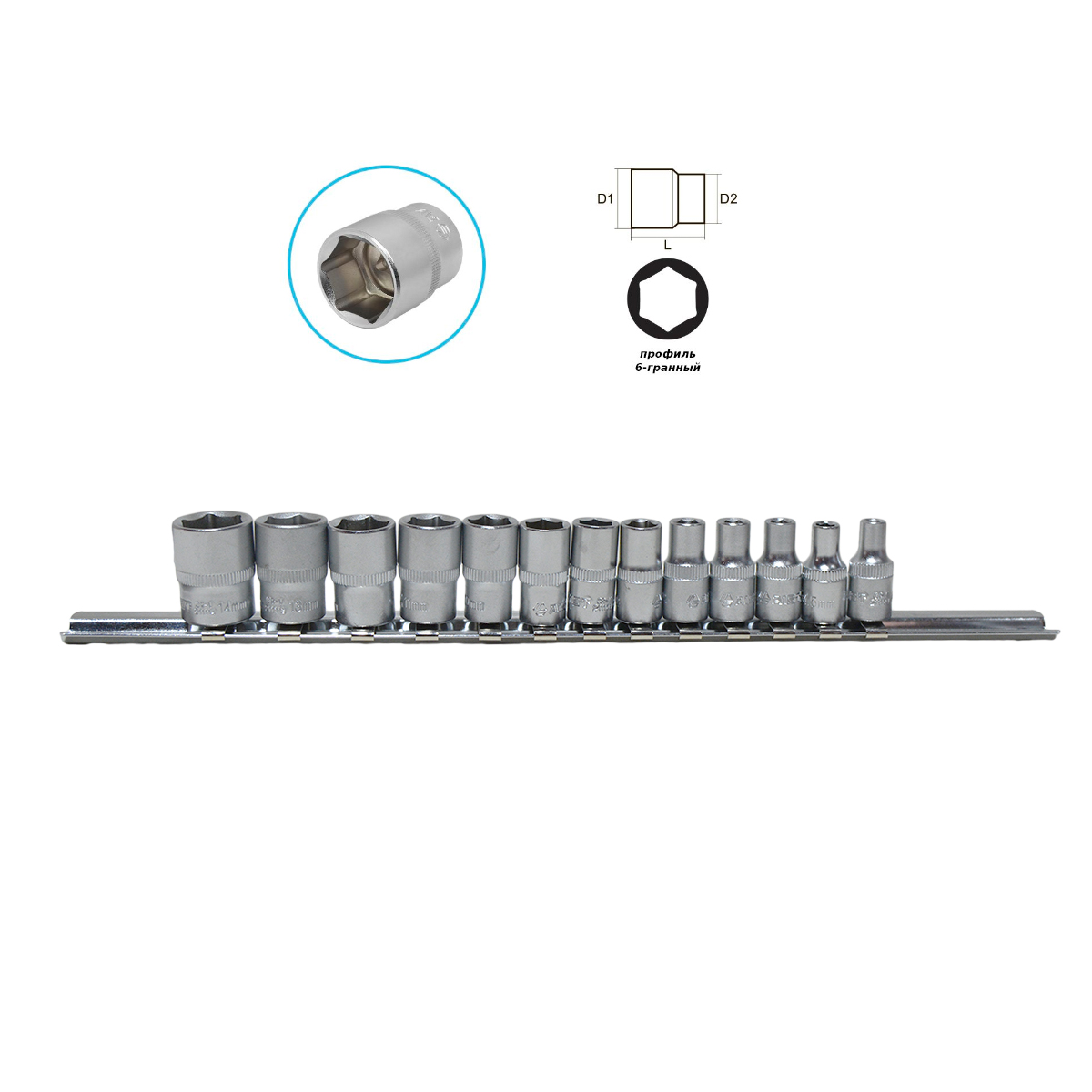 Набор головок 13 предметов 4-14мм (1/4") 6-гр. на планке