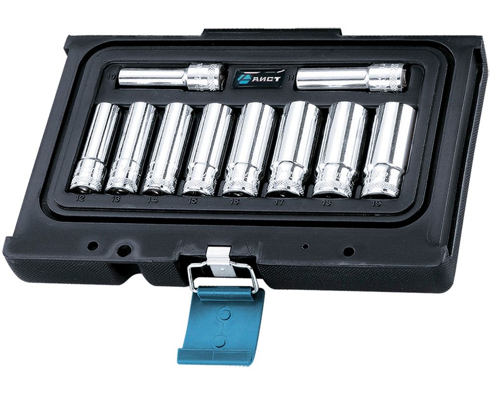 Набор сменных удлиненных торцевых головок 3/8" дюйма 6-гранных 10-19 мм 10 предметов в кейсе используется для взаимодействия с резьбовыми соединениями шестигранного профиля. Набор длинных шестигранных головок 3/8" включает ряд высоких головок размером от 10 мм до 19 мм. Для использования набора средних сменных глубоких головок 3/8" потребуется наличие воротка или трещотки с присоединительным квадратом 3/8" дюйма. Набор головок под среднюю трещетку или вороток. Набор глубоких шестигранных головок дает возможность использования насадок в труднодоступных местах или с крепежом на высокой шпильке.