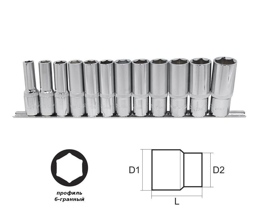 Набор головок глубоких 12 предметов 10-24мм (1/2") 6-гр. на планке