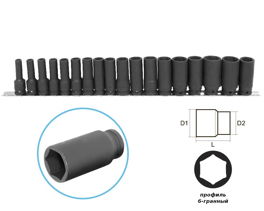1/2" Головка ударная глубокая: 8, 10, 11, 12, 13, 14, 15, 16, 17, 18, 19, 21, 22, 24, 27 мм