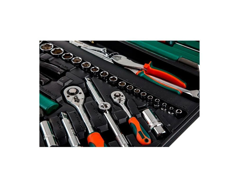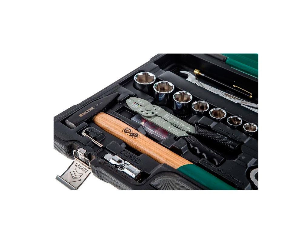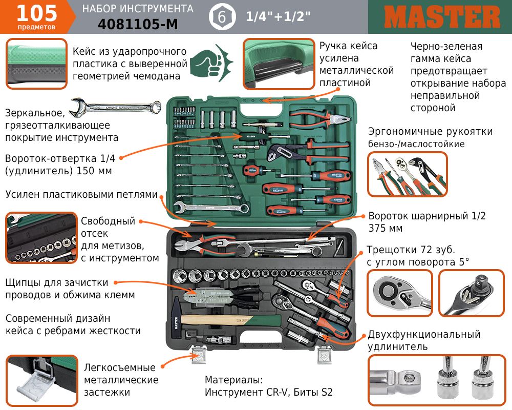 Универсальный набор инструментов 105 предметов включает в себя основной комплект автомобильных инструментов: шарнирно-губцевый инструмент, комбинированные ключи, кримпер, молоток, шарнирный вороток, магнитный захват, автомобильный тестер и отвертки. Высокое качество исполнения набора инструментов для авто в чемодане позволяет использовать инструмент при профессиональном ремонте автомобилей в условиях высоких нагрузок и для дома. Набор имеет пустой отсек для хранения различного инструмента. Набор инструментов 1/4 и 1/2 дюйма с 6-гранными головками.