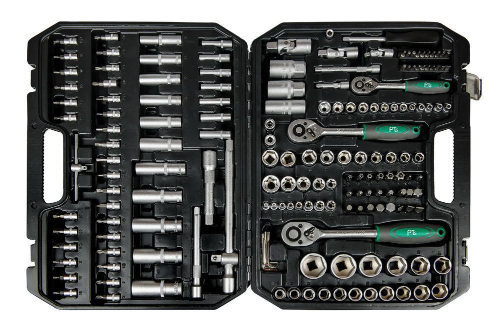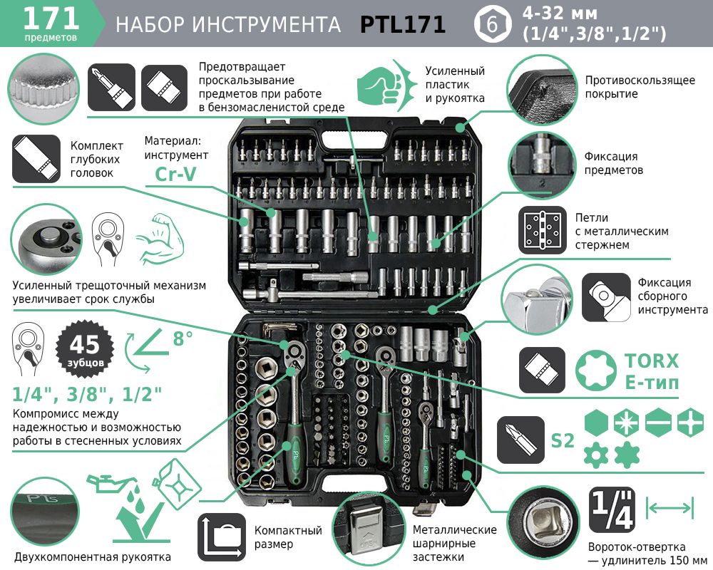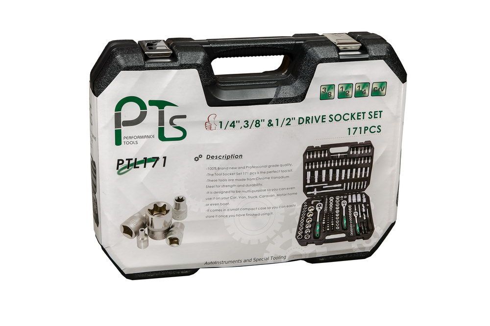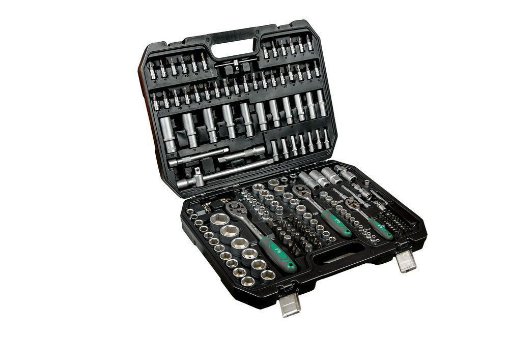 Набор инструментов 171 предмет предназначен для монтажа/демонтажа различных резьбовых соединений. Идеально подходит, как набор инструментов для авто в чемодане. Предметы набора выполнены из хромованадиевой стали (Chrome-Vanadium). Биты - сталь S2.