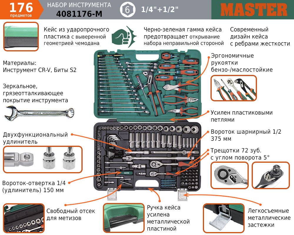 Профессиональный универсальный набор инструментов 176 предметов подходит для большинства резьбовых соединений. За счет комбинированных ключей, шарнирно-губцевых предметов и отверток набор инструмента 176 предмета может использоваться, как профессиональный набор автомобильных инструментов (набор инструментов для автомобиля), как набор инструментов для автосервиса, так и универсальный набор инструментов для дома. Высокое качество исполнения набора инструментов для авто в чемодане позволяет использовать инструмент при профессиональном ремонте автомобилей в условиях высоких нагрузок. За счет своей надежности набор инструментов для автомобиля может использоваться в автосервисе, в автомастерской, на СТО и т. д. Набор инструментов 1/4 и 1/2 дюйма с 6-гранными головками.