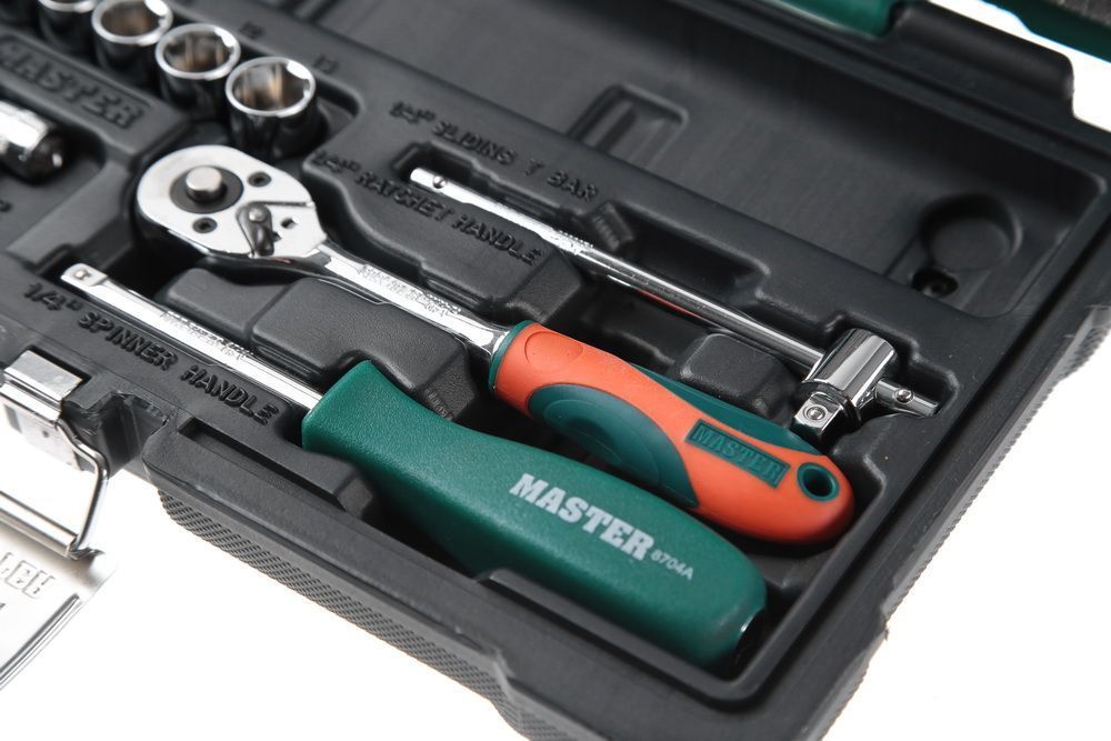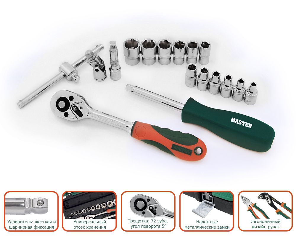 - Торцевые головки и ключи имеют глянцевое хромированное покрытие, минимизируя загрязнение инструмента;