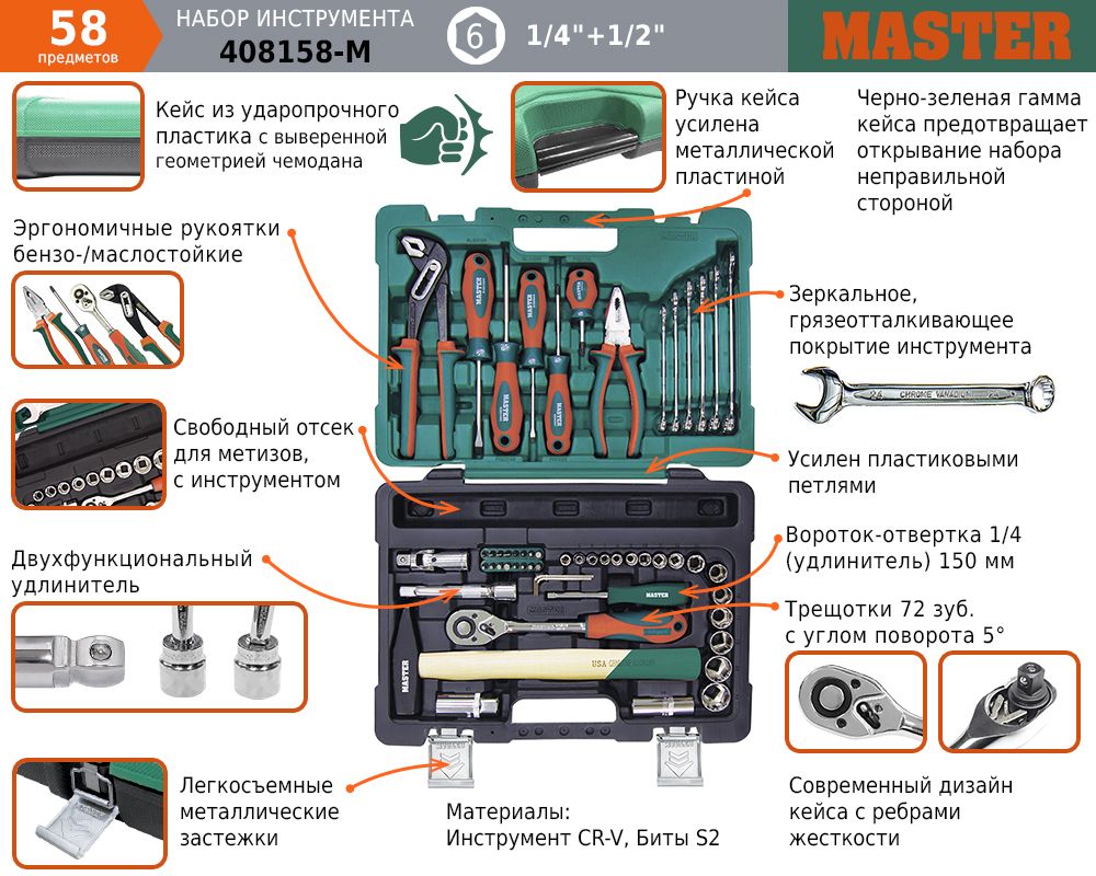 Универсальный набор инструментов 1/4" и 1/2" 58 предметов с 6-гранными головками, молотком, отвертками и ключами в кейсе со свободной нишей внутри. За счет своей комплектации универсальный набор инструментов подойдет для использования как набор инструментов для дома и автомобиля. Шарнирно-губцевый инструмент, отвертки и молоток всегда будут нужны в бытовом использовании, а наличие головок, трещотки, бит и гаечных ключей позволит работать с резьбовыми соединениями авто.
