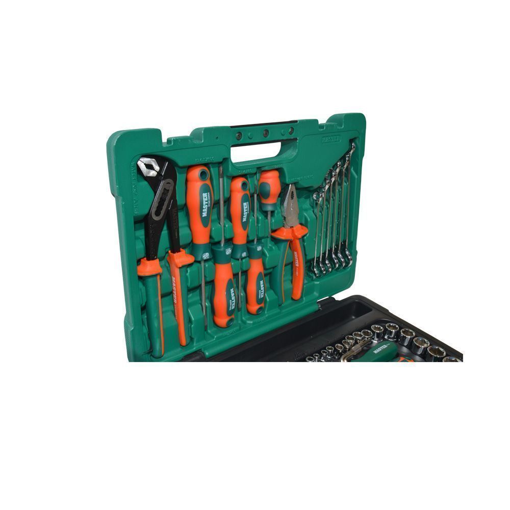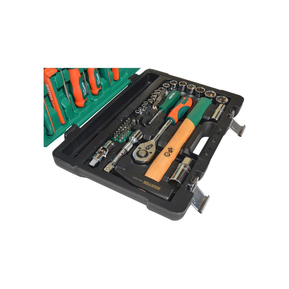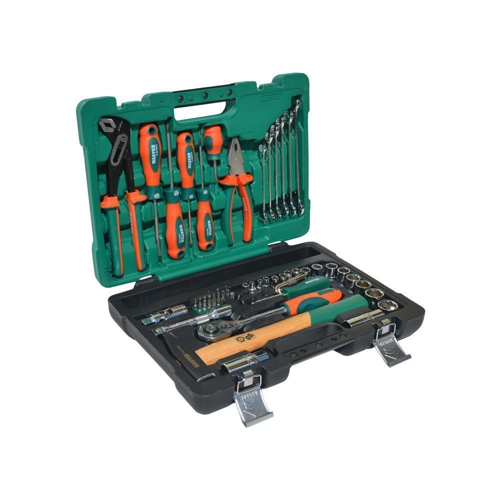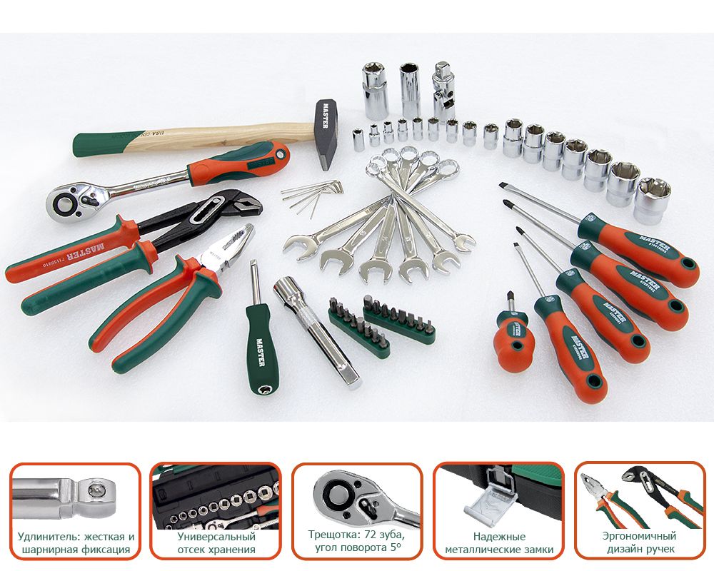 | Комплектация | Трещотка(и), Отвертка-вороток, Головка(и), Свечная головка(и), Удлинитель(и), Кардан(ы), Держатель(и) бит, Биты, Бит-адаптер для головок, Комбинированный ключ(и), Г-образный ключ(и) имбусовый, Отвертка(и), Плоскогубцы, Клещи переставные, Молоток |