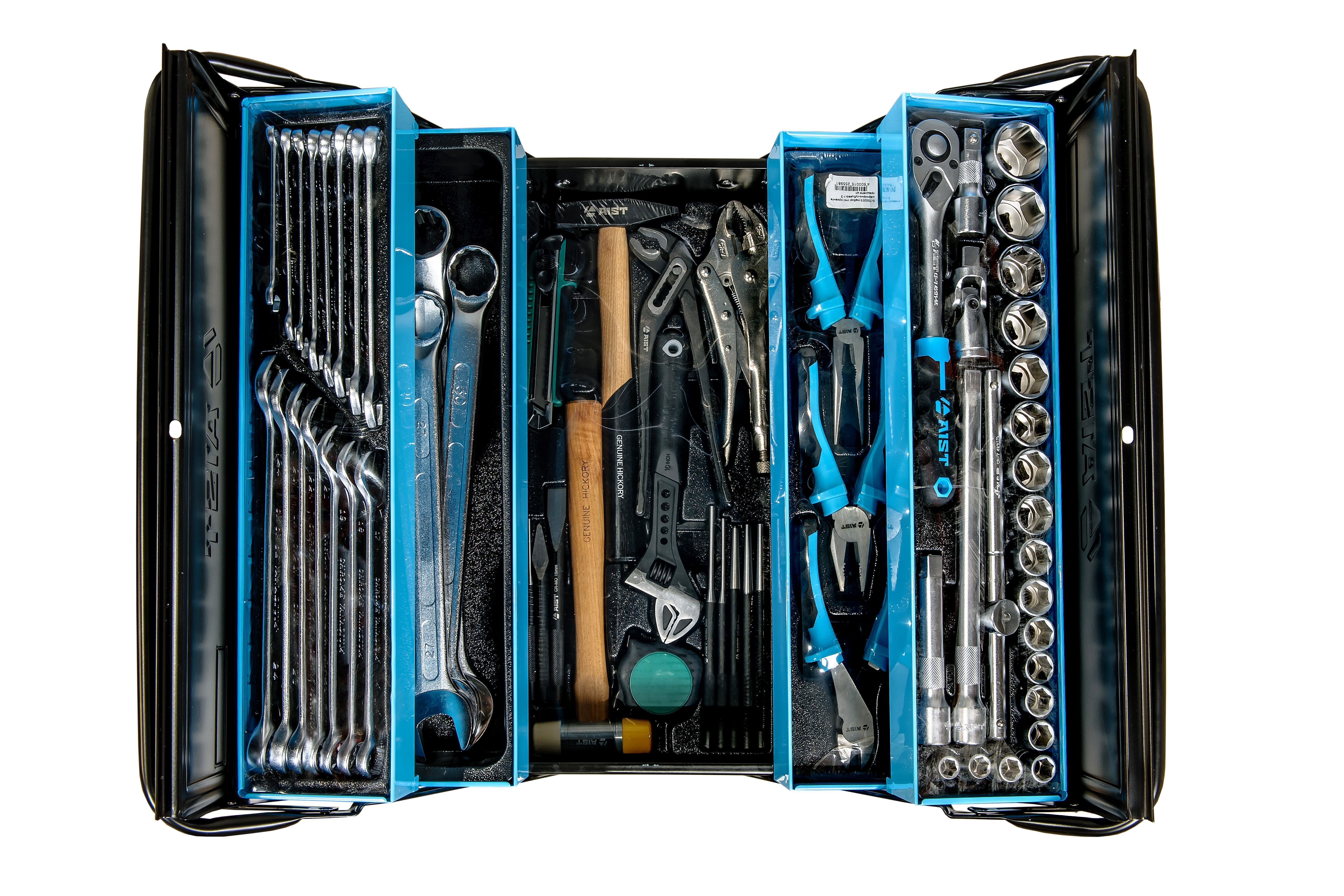 | Комплектация | Трещотка(и), Вороток Т-образный, Головка(и), Удлинитель(и), Кардан(ы), Комбинированный ключ(и), Ключ универсальный разводной, Плоскогубцы, Кусачки боковые (бокорезы), Клещи переставные, Ручной зажим с фиксатором, Утконосы прямые, Молоток, Зубило, Выколотка, Керн, Бородок, Молоток резиновый, Рукоятка магнитная (захват), Нож, Рулетка |