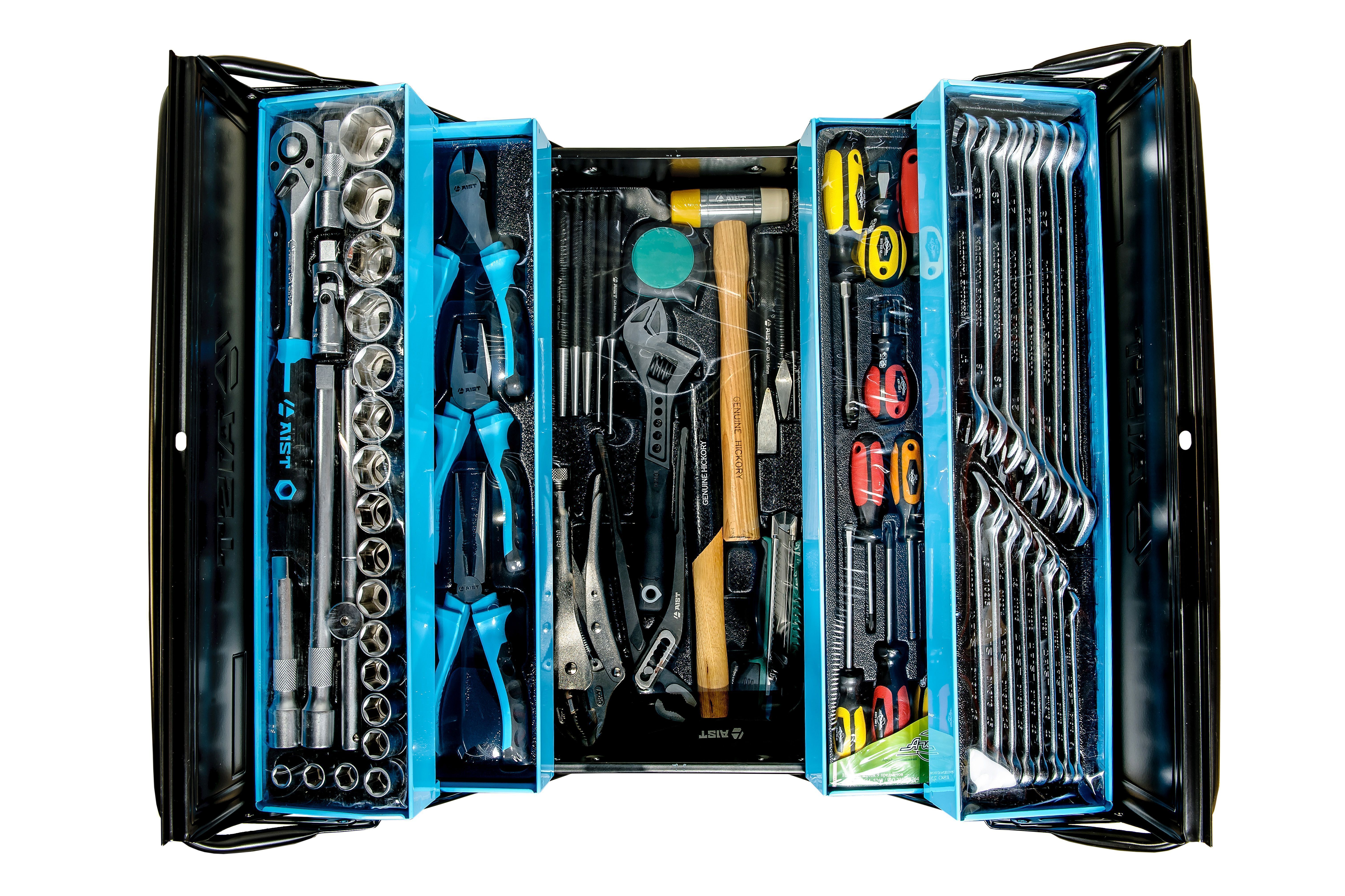 | Комплектация | Трещотка(и), Вороток Т-образный, Головка(и), Удлинитель(и), Кардан(ы), Комбинированный ключ(и), Ключ универсальный разводной, Отвертка(и), Отвертка(и) силовая под ключ, Плоскогубцы, Кусачки боковые (бокорезы), Клещи переставные, Ручной зажим с фиксатором, Утконосы прямые, Молоток, Зубило, Выколотка, Керн, Бородок, Молоток резиновый, Рукоятка магнитная (захват), Нож, Рулетка, Крейцмейсель |