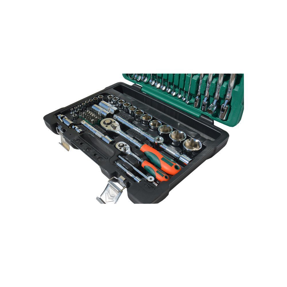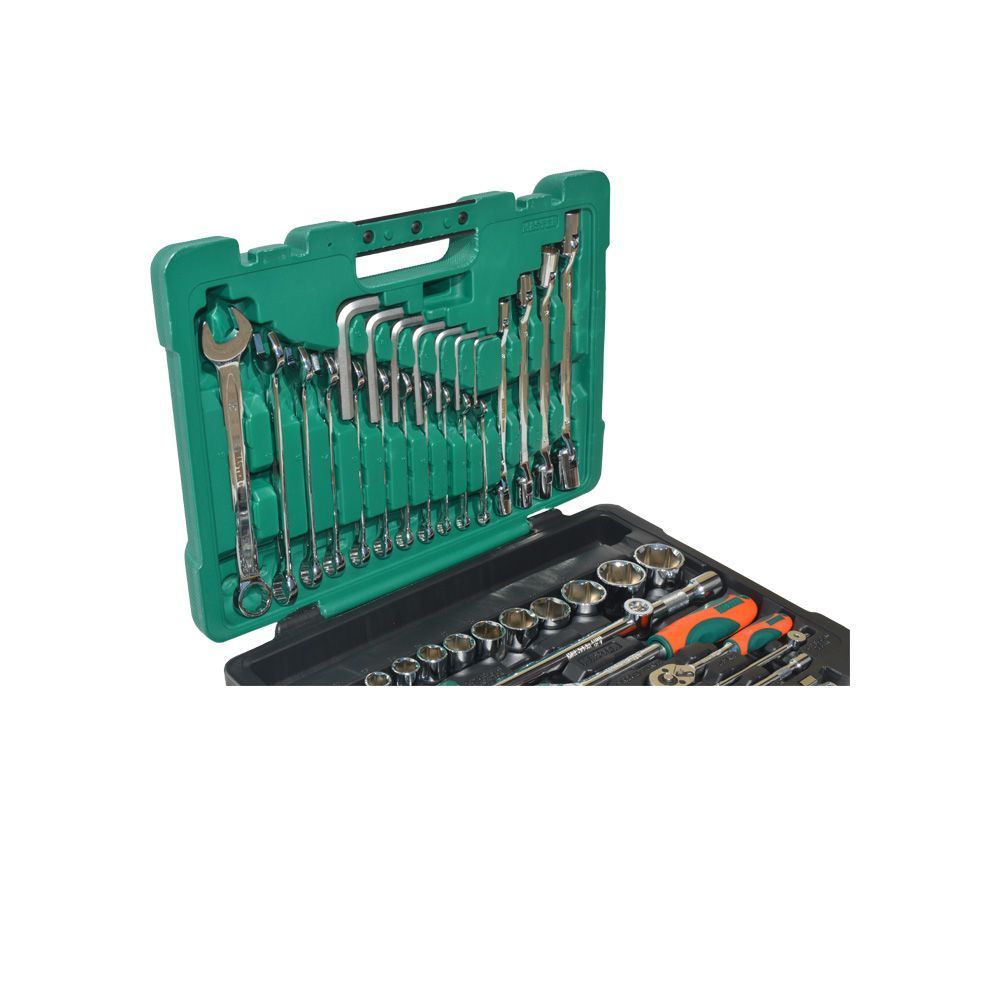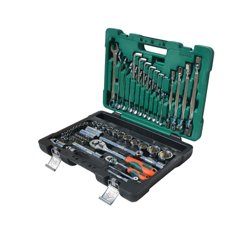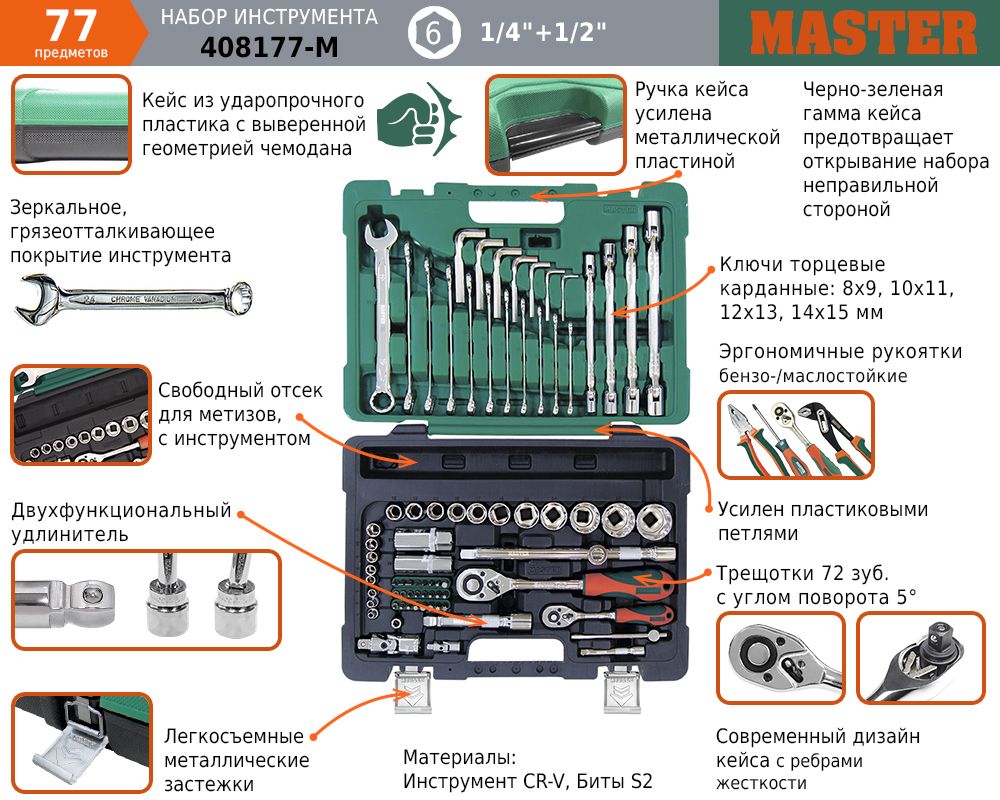 Набор инструментов 77 предметов включает в себя основной комплект автомобильных инструментов. За счет комбинированных ключей набор инструмента 77 предмета может использоваться, как профессиональный набор инструментов для автомобиля (набор инструментов для авто в чемодане), так и универсальный набор инструментов для дома. Высокое качество исполнения набора инструментов для авто позволяет использовать инструмент при профессиональном ремонте автомобилей в условиях высоких нагрузок. За счет своей надежности инструмент может использоваться в автосервисе, в автомастерской, на СТО и т. д. Набор инструмента 1/4, 1/2 дюйма с 6-гранными головками.