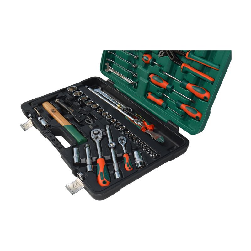 Универсальный набор инструментов 1/4" и 1/2" 78 предметов с 6-гранными головками, шарнирно-губцевым инструментом, ключами, молотком, ручным зажимом, шарнирным воротком, магнитным захватом и отвертками. Высокое качество исполнения набора инструментов для авто в чемодане позволяет использовать инструмент при профессиональном ремонте автомобилей в условиях высоких нагрузок и для дома. Набор имеет пустой отсек для хранения различного инструмента. За счет своей комплектации универсальный набор инструментов подойдет для использования как набор инструментов для дома и автомобиля. Шарнирно-губцевый инструмент, отвертки и молоток всегда будут нужны в бытовом использовании, а наличие головок, трещоток, бит и гаечных ключей позволит работать с резьбовыми соединениями авто.