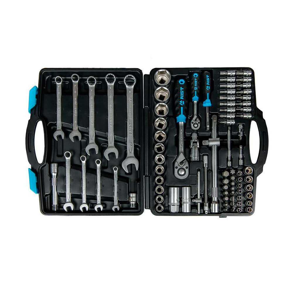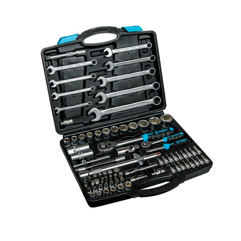 Набор инструментов 82 предмета подходит для работы с резьбовыми соединениями. За счет комбинированных ключей набор может использоваться для автомобиля, для автосервиса, как универсальный набор инструментов для дома. Высокое качество исполнения набора инструментов позволяет использовать инструмент при профессиональном ремонте автомобилей в условиях повышенных нагрузок. Набор инструментов 1/4, 1/2 дюйма с 6-гранными головками и комбинированными гаечными ключами.