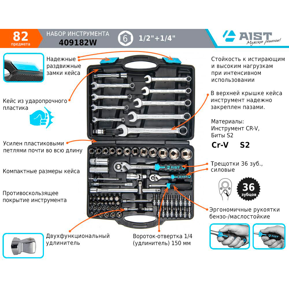 Линейка наборов инструментов AIST приспособлена для работы в тяжелых российских условиях. Трещотки имеют усиленный механизм на 36 зубов. Удобные маслобензостойкие рукоятки с эргономичным дизайном под выемки пальцев позволяют при большем крутящем моменте затрачивать меньшее усилие. Эргономика рукояток обеспечивает надежный захват, комфорт при работе, предотвращает возможные повреждения конечности, снижая усталость и мышечное напряжение. Набор инструментов прекрасно переносит высокие нагрузки при интенсивном и профессиональном использовании.