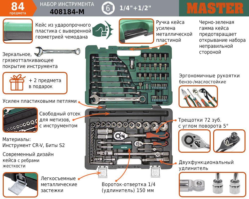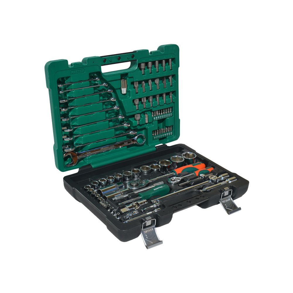 Набор инструментов 82 предмета включает в себя основной комплект автомобильных инструментов. За счет комбинированных ключей комплект может использоваться для автомобиля (для авто в чемодане), для автосервиса и как универсальный набор инструментов для дома. Высокое качество исполнения позволяет использовать инструмент при профессиональном ремонте автомобилей в условиях высоких нагрузок. За счет своей надежности инструмент может использоваться в автосервисе, в автомастерской, на СТО и т. д. Инструмент имеет двухкомпонентные бензомаслостойкие рукоятки эргономичной формы. Набор инструментов 1/4, 1/2 дюйма с 6-гранными головками и комбинированными гаечными ключами.