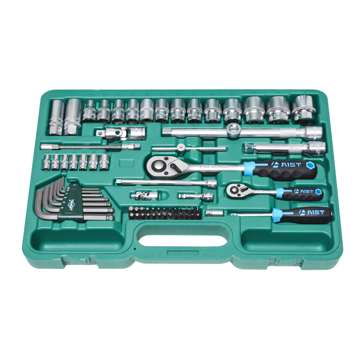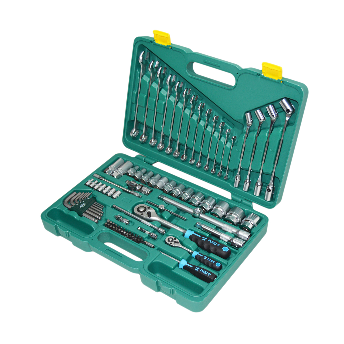 Набор инструментов 87 предметов подходит для работы с резьбовыми соединениями. За счет комбинированных ключей набор может использоваться для автомобиля, для автосервиса, как универсальный набор инструментов для дома. Высокое качество исполнения набора инструментов позволяет использовать инструмент при профессиональном ремонте автомобилей в условиях повышенных нагрузок. Набор инструментов 1/4, 1/2 дюйма с 6-гранными головками и карданными, комбинированными гаечными ключами.