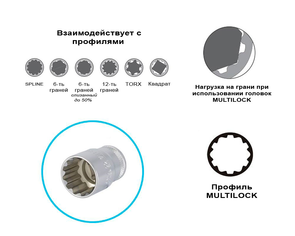 - профиль MULTILOCK ("ML") / Super Tech / Multiprof - многофункциональный профиль, который позволяет использовать один размер для рабочих элементов крепежа различного типа, имеющего в сечении: TORX, шестигранник и двенадцатигранник (метрического и дюймового размеров), треугольник и квадрат. Может быть использован для поврежденного крепежа на 50%. Пятно контакта с крепежом у профиля MULTILOCK распределено по большой площади – за счет этого данным профилем можно закрутить разный по форме крепеж.