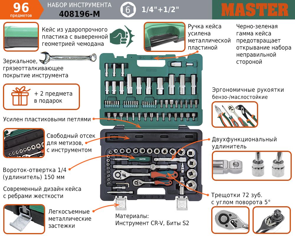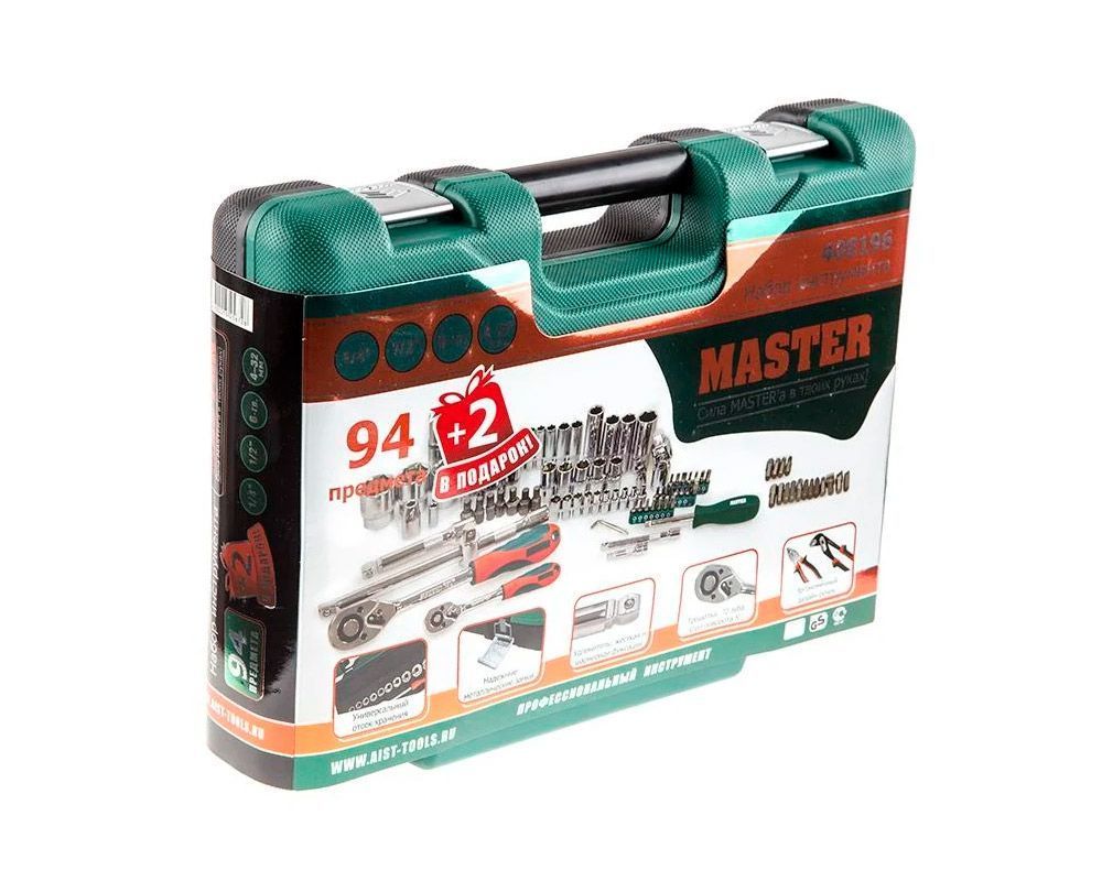 Набор инструментов 94 предмета включает в себя основной комплект автомобильных инструментов. Высокое качество исполнения набора инструментов позволяет использовать инструмент при профессиональном ремонте автомобилей в условиях высоких нагрузок. За счет высокой надежности инструмент может использоваться, как набор инструментов для автосервиса, автомастерской, СТО, для автомобиля (для авто в чемодане) и т. д. В комплектации набора инструментов 94 предмета + 2 дополнительных (подарок). Набор имеет пустой отсек для хранения различного инструмента или метизов. Набор инструментов для автомобиля 1/4 и 1/2 дюйма с 6-гранными головками.