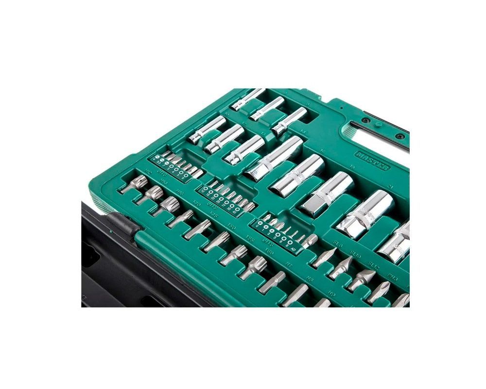 В кейсе 95 посадочных мест (в основании 36 + 59 в крышке), но удлинитель 1/2" имеет бегунок адаптер-переходник с 3/8" на 1/2", образуя вороток, поэтому набор состоит из 96 предметов (94 предмета + 2 дополнительных в подарок).