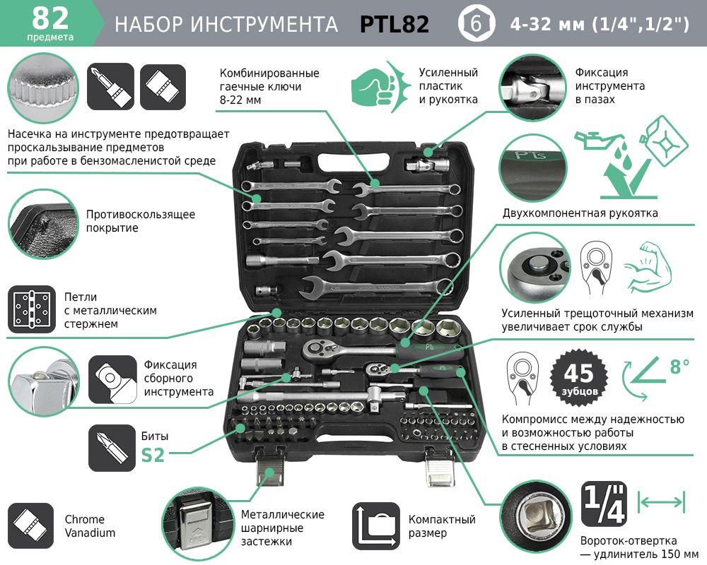 Набор инструментов 82 пр. 4-32мм (1/4",1/2") 6-гр