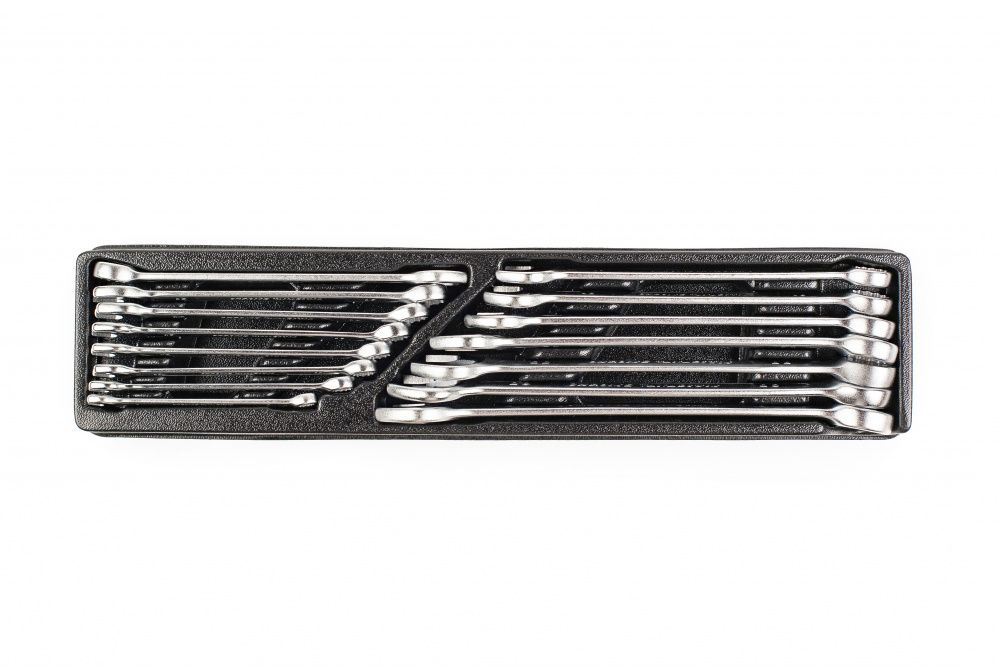 Профессиональный набор рожково-накидных гаечных ключей размером от 8 до 24 мм 15 шт. используется для работы с резьбовыми соединениями указанного размера. Применяется в сфере ремонта различной техники. Набор гаечных комбинированных ключей поставляется в ложементе для комплектации инструментальной тележки, слесарного верстака или ящика.