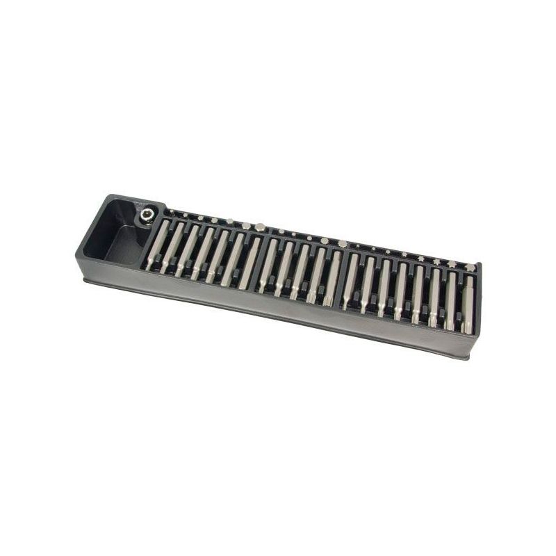 Профессиональный набор разнопрофильных бит 10 мм: HEX, TORX, SPLINE 30/75мм 41 предмет в ложементе 110х470х50мм для инструментальной тележки. В набор бит входят битодержатель (адаптер для бит) с присоединительным квадратом 1/2". Набор ударных силовых битов под шестигранник 10 мм.