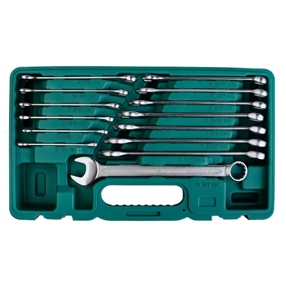 Набор гаечных комбинированных ключей поставляется в чемодане (кейсе), обеспечивая компактное хранение и сохранность инструмента.