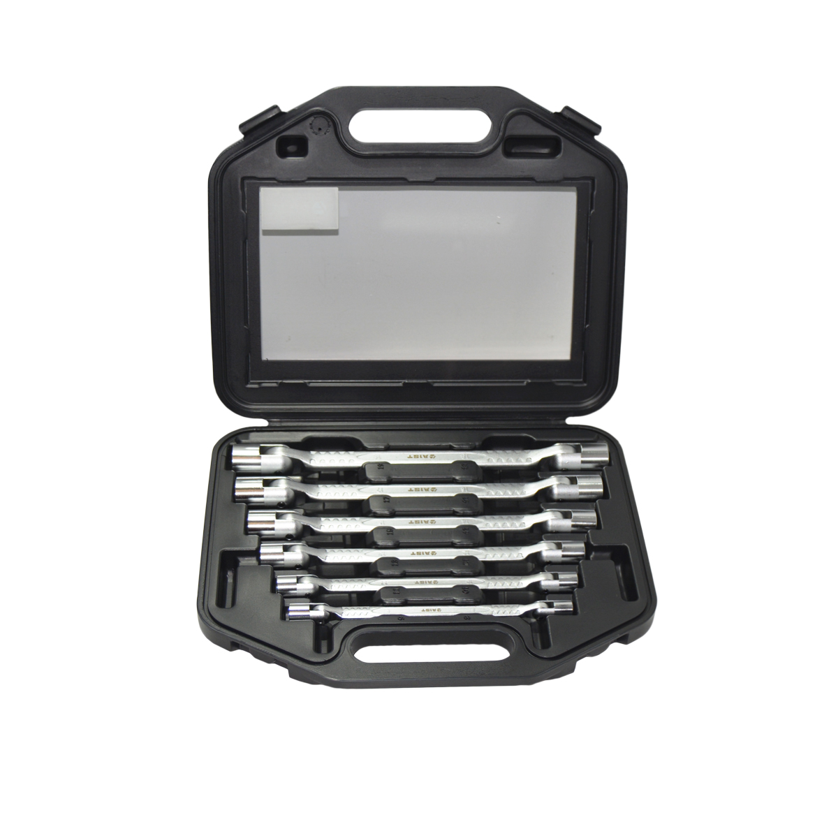 Профессиональный набор ключей торцевых шарнирных (карданных) размером от 8 до 19 мм с 12-гранным профилем. Набор ключей колокольчиков поставляется в пластиковом кейсе. Набор ключей с шарнирными головками изготовлен из хромванадиевой стали.