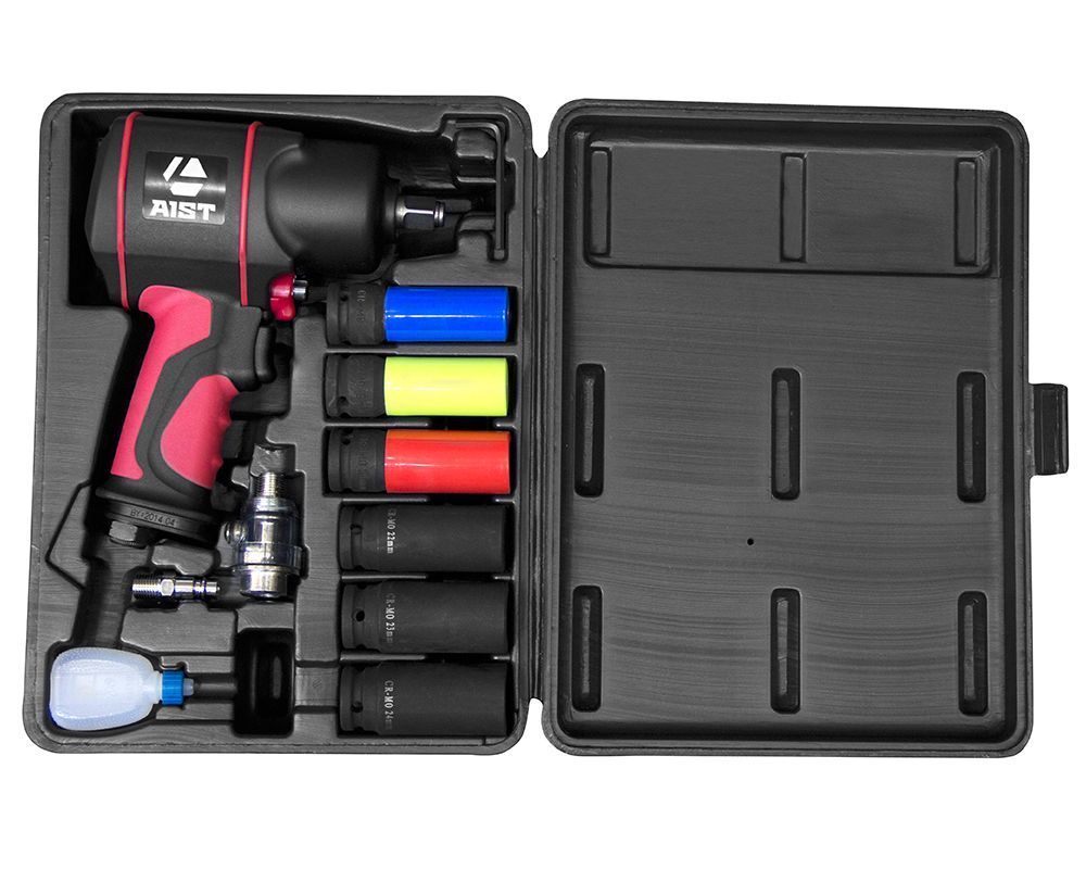 Мощный и легкий профессиональный пневмогайковерт ударный на 1/2 дюйма с набором головок имеет композитный корпус, 3-ри положения регулировки мощности на закручивание и 3-ри скорости на откручивание (реверс). Ударный пневмогайковерт идеально подходит для оснащения шиномонтажа или автосервиса, а также для гаража. Реальное развиваемое усилие пневматического гайковерта на 125 кг-м/1220 Нм проверялось на специальном динамометрическом стенде. Ударный механизм TWIN HAMMER, обеспечивает плавный и сбалансированный "удар", низкий уровень вибрации и высокий крутящий момент на старте работы. Использовать пневматический гайковерт необходимо только с ударными торцевыми головками. Также для долговечности работы пневмогайковерта необходимо смазывать инструмент, используя лубрикатор или капать масло во внутрь гайковерта через отверстие внизу рукоятки. Удобный переключатель реверса находится на передней стороне пневмогайковерта. Имеет эргономичную рукоятку.