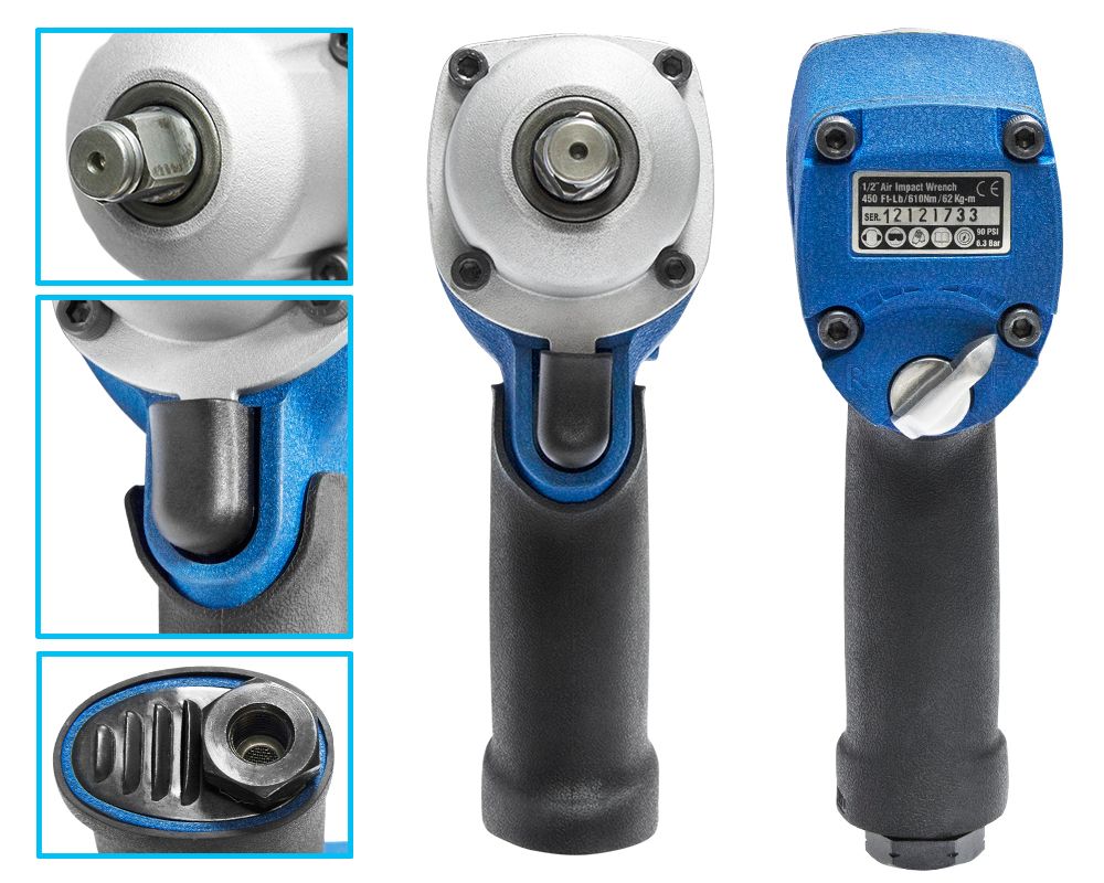 Компактный и легкий профессиональный пневмогайковерт ударный на 1/2 дюйма имеет металлический корпус, 3-ри положения регулировки мощности на закручивание и 3-ри скорости на откручивание (реверс). Ударный пневмогайковерт идеально подходит для работы в стесненных условиях. Реальное развиваемое усилие пневматического гайковерта на 62 кг-м/610 Нм проверялось на специальном динамометрическом стенде. Ударный механизм TWIN HAMMER, обеспечивает плавный и сбалансированный "удар", низкий уровень вибрации и высокий крутящий момент на старте работы. Использовать пневматический гайковерт необходимо только с ударными торцевыми головками. Также для долговечности работы пневмогайковерта необходимо смазывать инструмент, используя лубрикатор или капать масло во внутрь гайковерта через отверстие внизу рукоятки. Удобный переключатель реверса находится на задней стороне пневмогайковерта. Имеет эргономичную рукоятку.