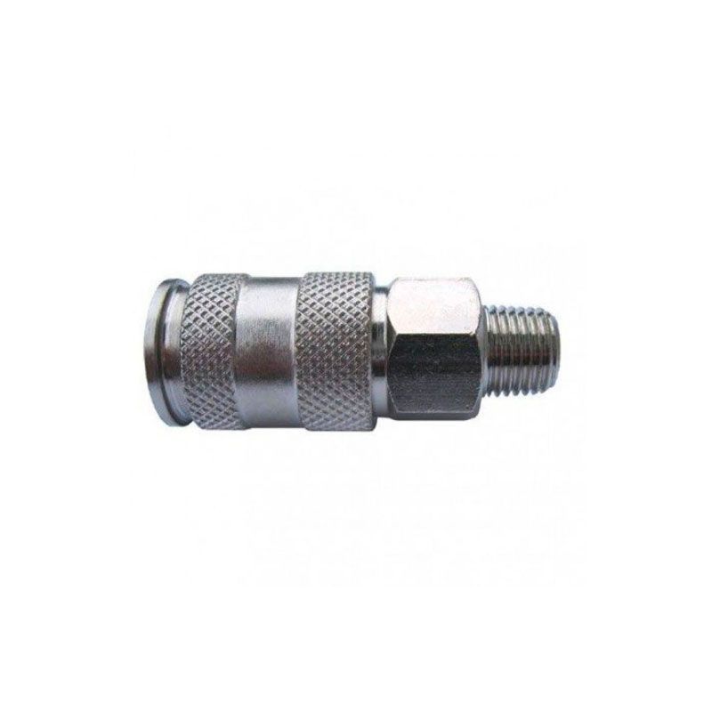 Быстросъемное соединение для воздуха "мама"-"наруж. резьба" 1/4" дюйма используется для соединения пневмоинструмента, шлангов и компрессорного оборудования. Быстроразъемное соединение для пневматики с обратным клапаном изготовлено из никелированной латуни.