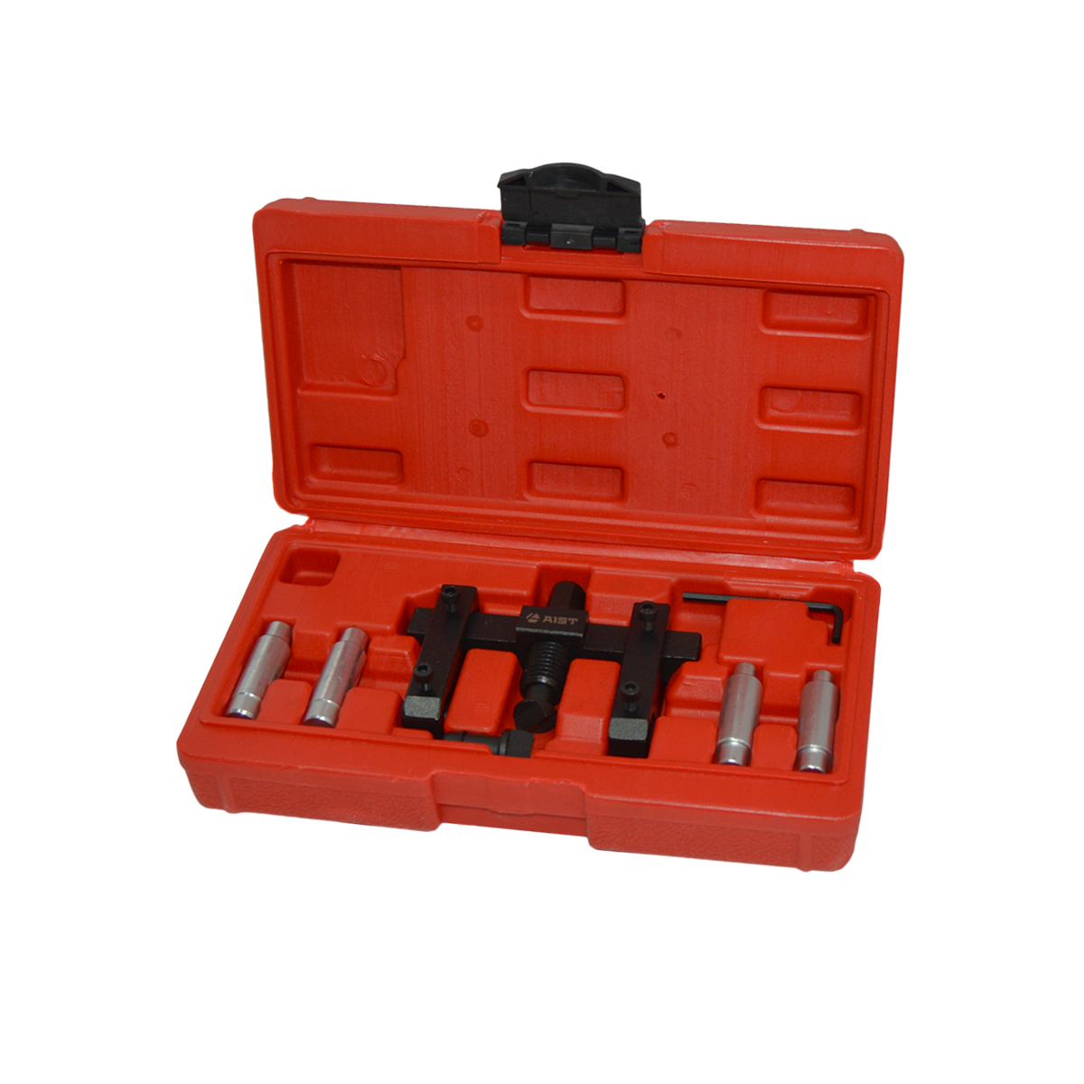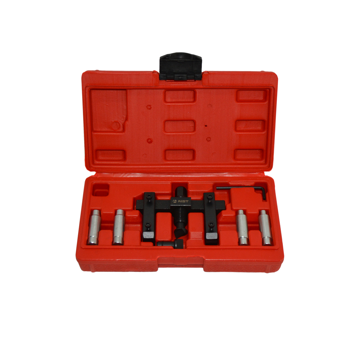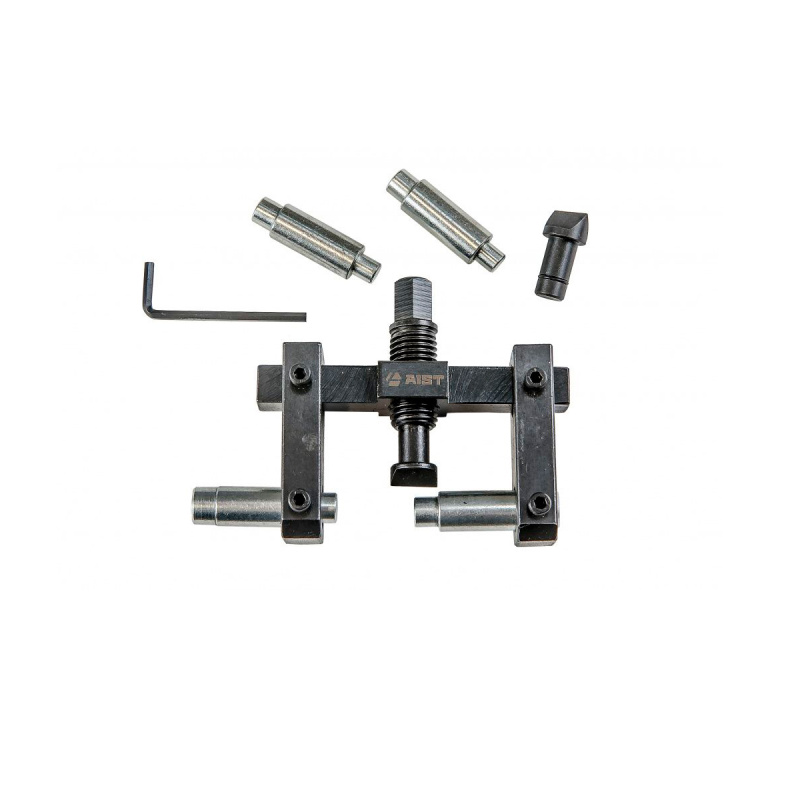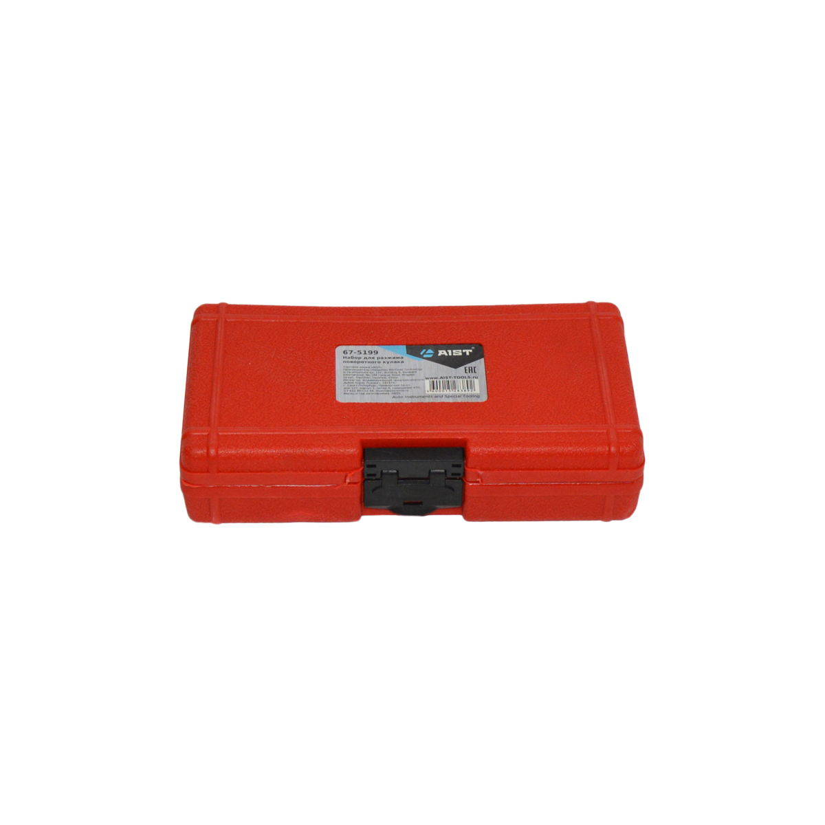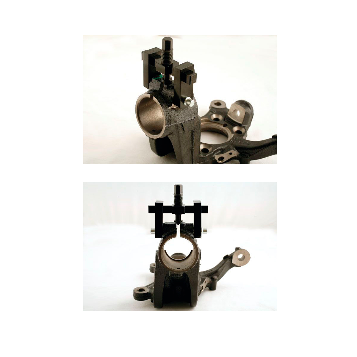 Данный набор позволяет разжать посадочную муфту без риска повреждения корпуса поворотного кулака при выполнении монтажных/демонтажных работ. Приспособление для развальцовки посадочных мест на поворотном кулаке поставляется в кейсе. Универсальное приспособление для расклинивания посадочных мест на поворотном кулаке. Набор предназначен для разжатия крепления амортизатора с целью монтажа/демонтажа без риска повреждения поворотного рычага подвески.