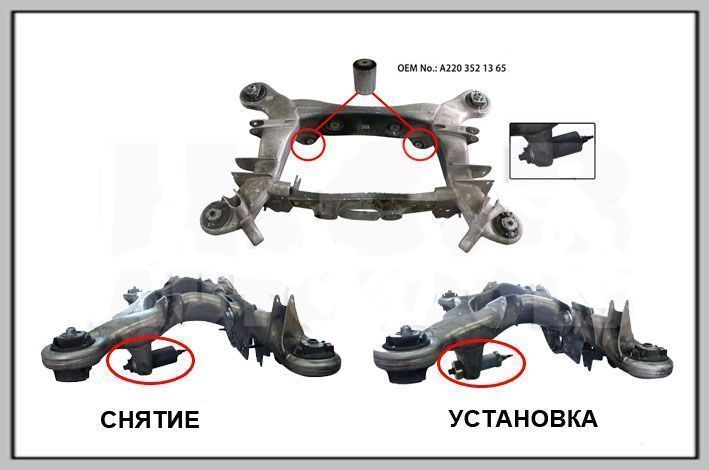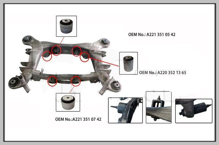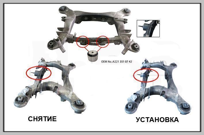 Данный набор предназначен для замены сайлентблоков дифференциала, находящихся в подрамника без его снятия с автомобиля. Подходит для Mercedes-Benz W221 и W216.