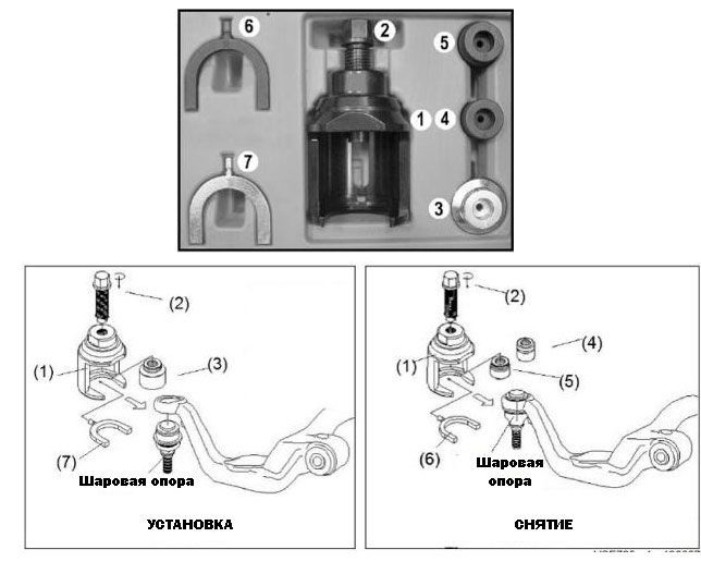 Съемник используется для замены верхних шаровых опор на передней подвеске VW T4. Подходит для Volkswagen T4 с дизельным и бензиновым двигателем 2.0 л. и 2.4 л.